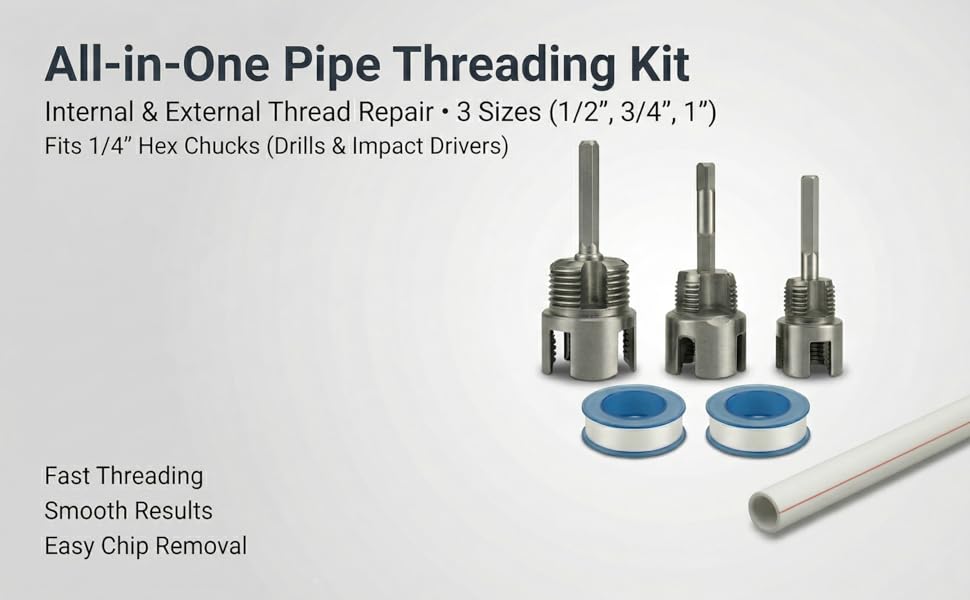 تتضمن العبوة ونصائح - تتضمن مجموعة خيط أنابيب PVC مكونة من 3 قطع (1/2 بوصة، 3/4 بوصة، 1 بوصة) و2 لفتين من شريط إغلاق الخيط. مصممة للاستخدام مع المثقاب الكهربائي؛ استخدم ضغطًا ثابتًا واستخدم التشحيم الخفيف للحصول على نتائج خيوط أكثر سلاسة ونظافة.