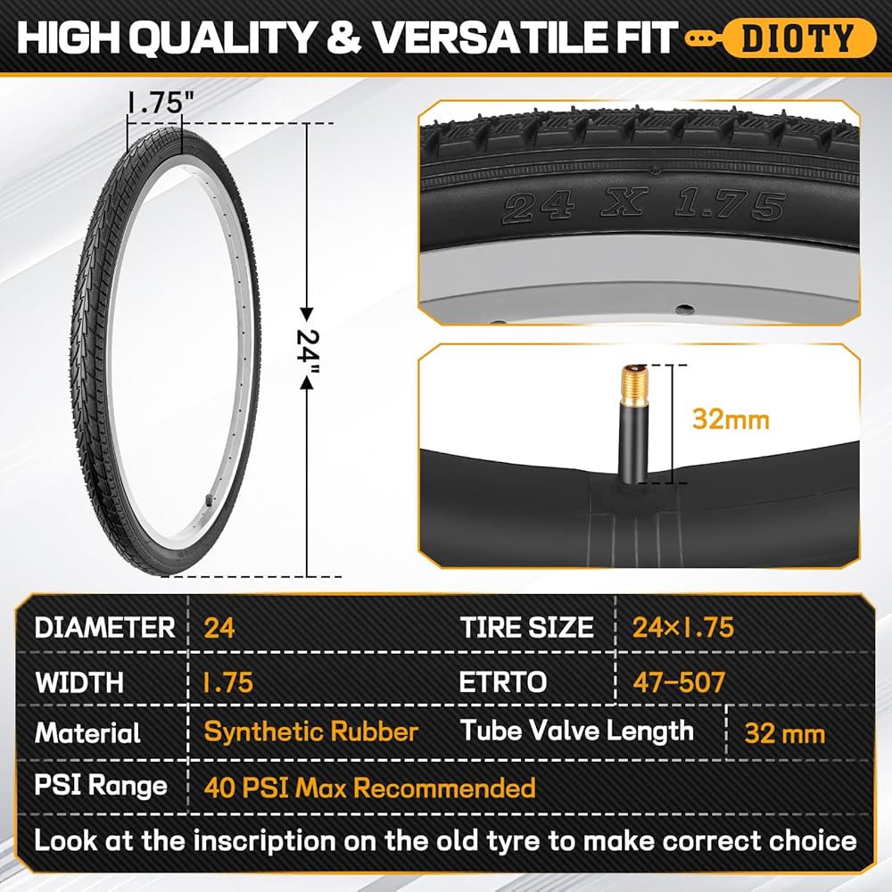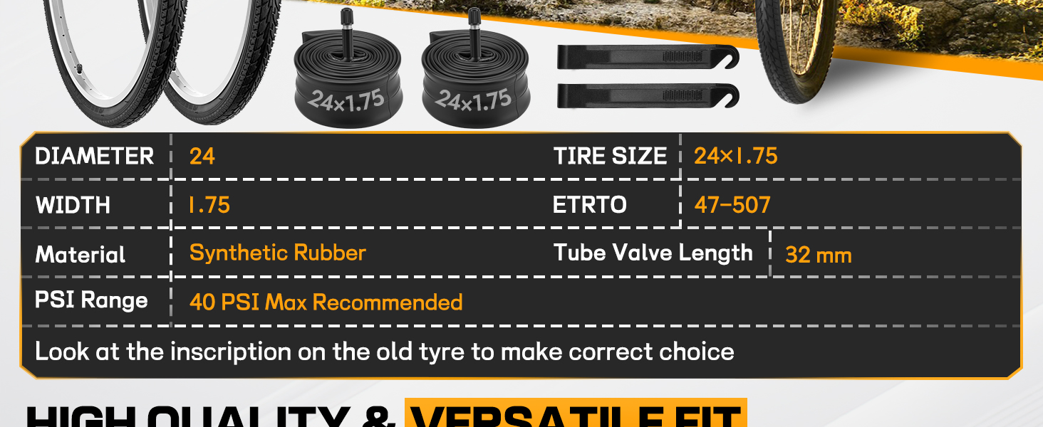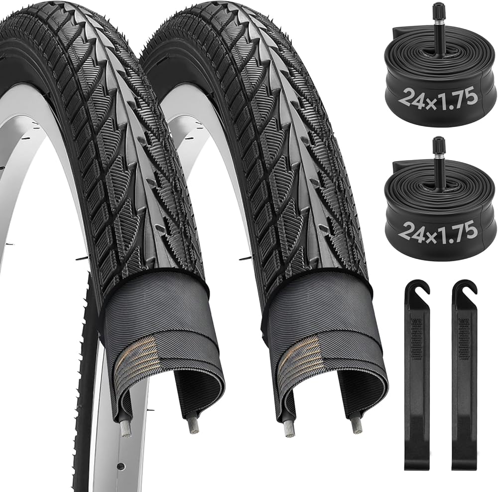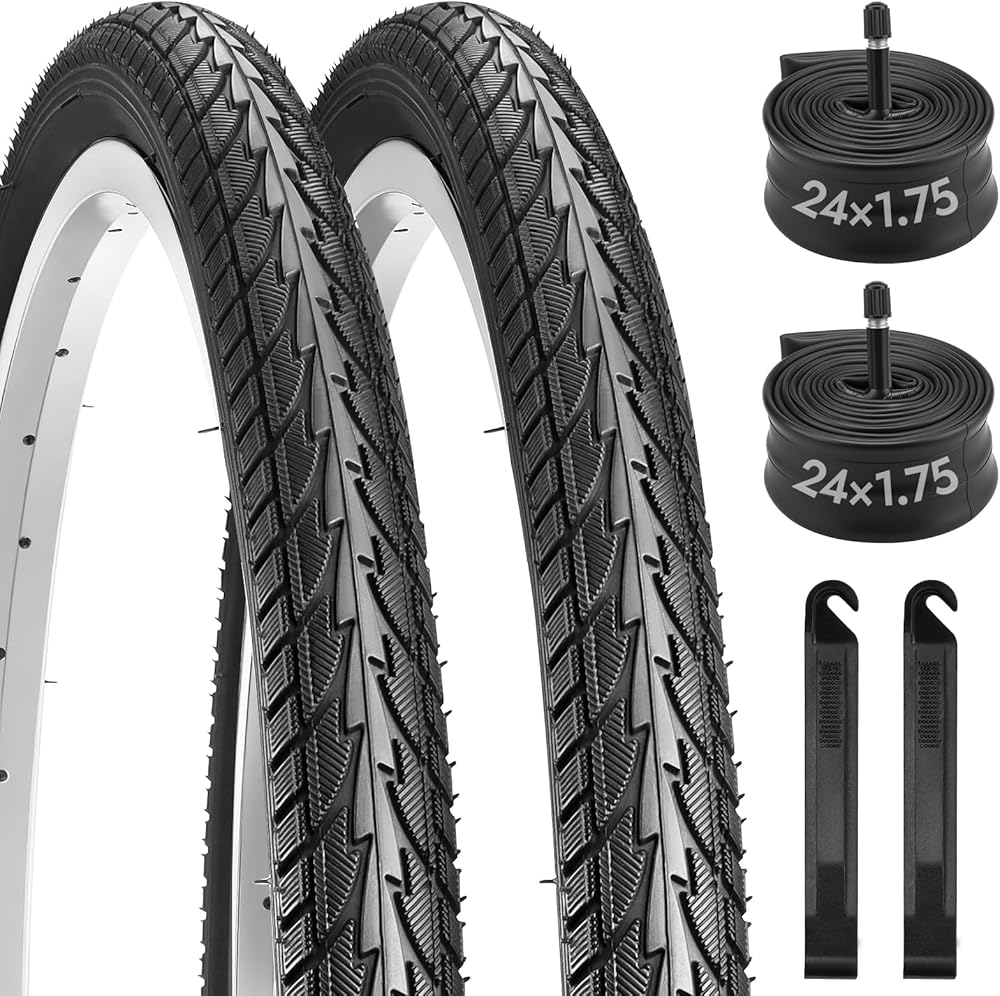 【تشمل العبوة: 2 × 24 × 1.75 بوصة، و2 × أنابيب داخلية للدراجة، و2 × رافعة للإطارات. تم تصميم مجموعة إطارات الدراجة مقاس 24 بوصة لمجموعة واسعة من الدراجات مقاس 24 بوصة. وهي تناسب تمامًا الأحجام القياسية مثل 24 × 1.75، و24 × 1.95 و24 × 2.0، مما يجعلها بديلاً مثاليًا لإطارات الدراجة.