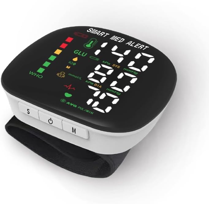 The Smart Med Alert Blood Pressure Monitor delivers accurate readings, with automatic detection. The 2-user memory function stores up to 198 readings, helping you and a partner track progress. The large LCD display features oversized digits for easy readability, even in low-light conditions, and a one-button start for quick, hassle-free measurements. The adjustable cuff fits most adult wrist sizes, ensuring a secure, comfortable fit for precise readings. Portable and rechargeable, the monitor includes a carrying case for convenient on-the-go use, with the built-in battery offering up to 198 measurements or about 90 days of use on a single charge.