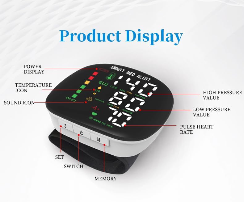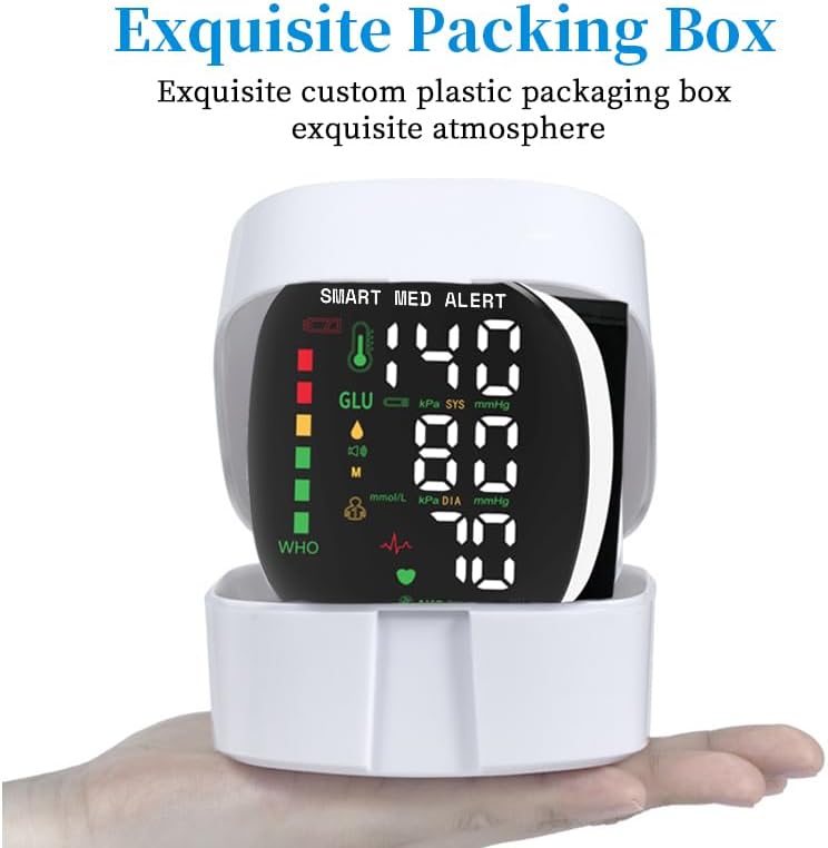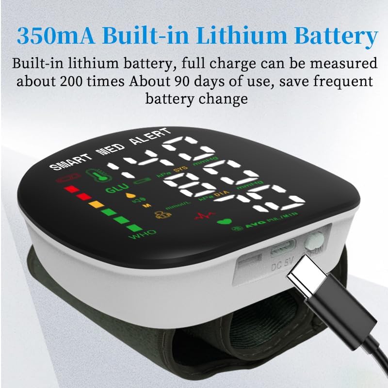 جهاز قياس ضغط الدم الذكي Med Alert، جهاز BP رقمي للمعصم قابل لإعادة الشحن مع أساور قابلة للتعديل، تخزين الذاكرة لمستخدمين، شاشة LCD، مثالية للاستخدام المنزلي، حقيبة حمل