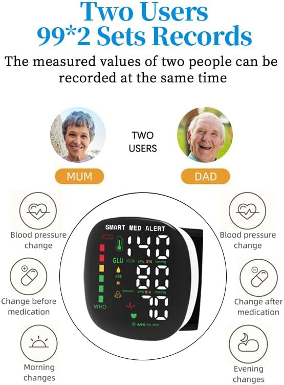 2-USER MEMORY FUNCTION: Our wrist BP machine stores up to 99 readings per user (198 readings in total), allowing you and a partner to track progress over time.