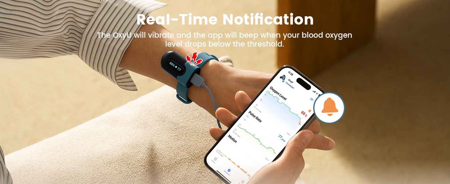 إشعار ذكي: سوف يهتز OxyU وسيصدر التطبيق صوت تنبيه إذا انخفض مستوى الأكسجين في الدم لديك عن الحد المحدد مسبقًا (قابل للتخصيص بين 80% و95%). يمكنك ضبط هذه القيمة في التطبيق