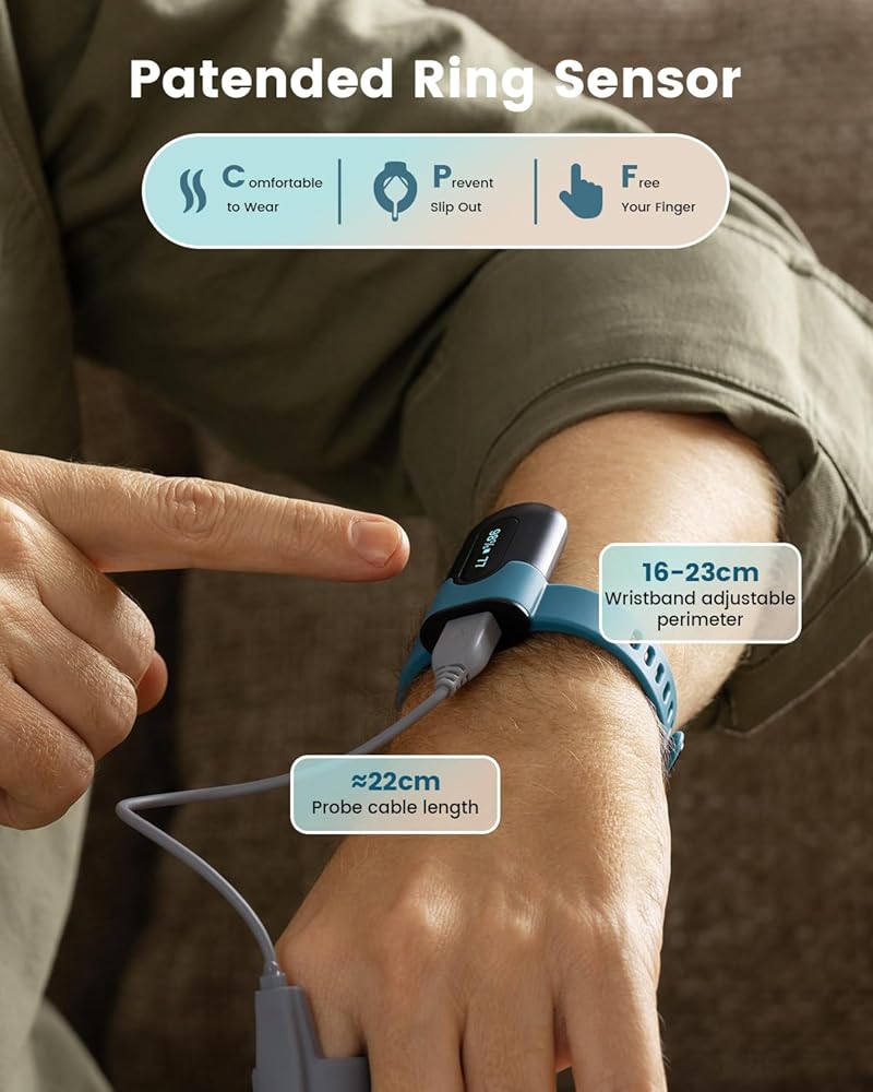 مستشعر حلقة ناعم ومريح: توفر حلقة السيليكون خفيفة الوزن والمدمجة شعورًا مريحًا للتتبع المستمر، وتناسب معظم أحجام الأصابع. (محيط قابل للتعديل: 16-23 سم، طول كابل المسبار: ≈22 سم، الوحدة الرئيسية: 5 سم × 3 سم)