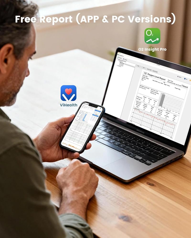 تسجيل البيانات التفصيلية وتصدير تقارير الكمبيوتر: يوفر التطبيق إمكانية التصدير والمشاركة مجانًا بنقرة واحدة (بتنسيقات PDF أو CSV أو ثنائي) ويسمح لك بإدارة تقارير الأكسجين في الدم على جهاز الكمبيوتر، بالإضافة إلى جمع البيانات عالية التردد كل 4 ثوانٍ.