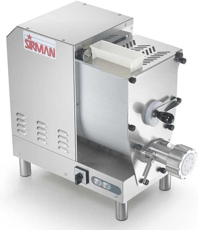 The Sirman CONCERTO 5 Pasta Extruder is a powerful and efficient pasta-making machine, designed for medium-duty operations in small to medium-sized restaurants. Built with AISI 304 stainless steel, this pasta extruder is durable, hygienic, and easy to clean, ensuring long-lasting performance in commercial kitchens. Equipped with a 370W air-cooled motor and an oil-bath gearbox, the CONCERTO 5 is optimized for heavy-duty use. The forced air-cooling system prevents overheating, while the high-performance kneading paddle is easy to remove for quick cleaning. The interlocked stainless steel lid ensures safe operation, and the bowl can be disassembled and removed effortlessly, making sanitation simple. For added convenience, the removable funnel allows for easy addition of liquid ingredients during processing, and the stainless steel worm, head, and ring provide superior durability. Compatible with a full range of pasta dies, the CONCERTO 5 also features an optional variable-speed pasta cutter, making it a versatile and essential tool for fresh pasta production.