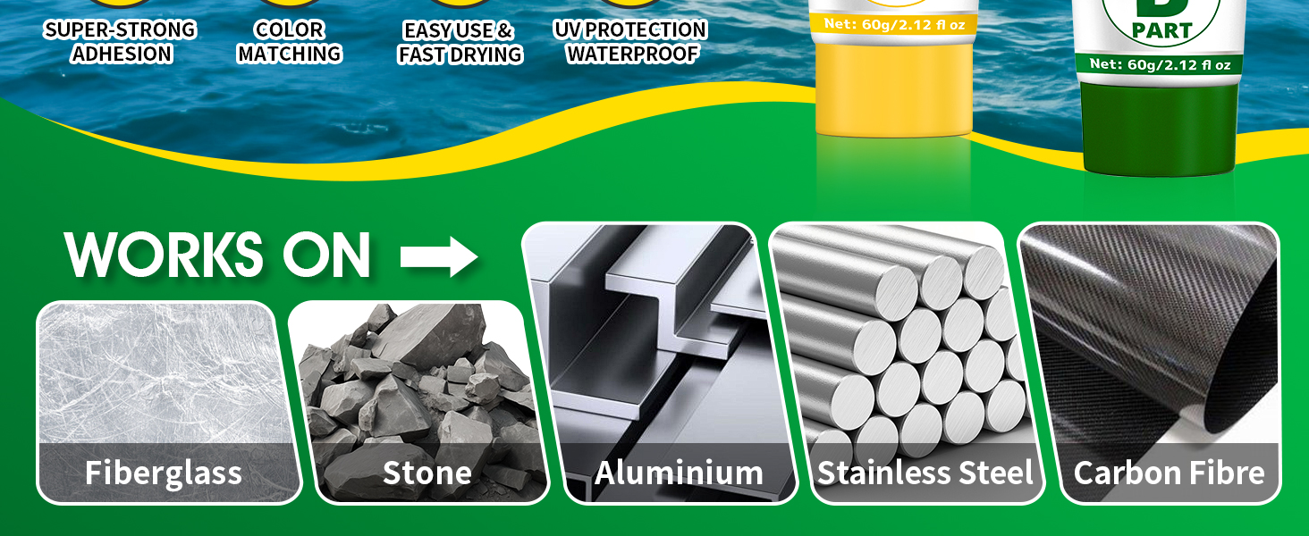 مناسبة لمجموعة متنوعة من المواد: إصلاح الألياف الزجاجية والفولاذ والألومنيوم والخشب وألياف الكربون والبلاستيك والفولاذ المقاوم للصدأ فوق خط الماء. إذا كانت لديك أي أسئلة حول مجموعات الإصلاح الخاصة بنا، فلا تتردد في الاتصال بنا وسنقدم لك إجابة مرضية.