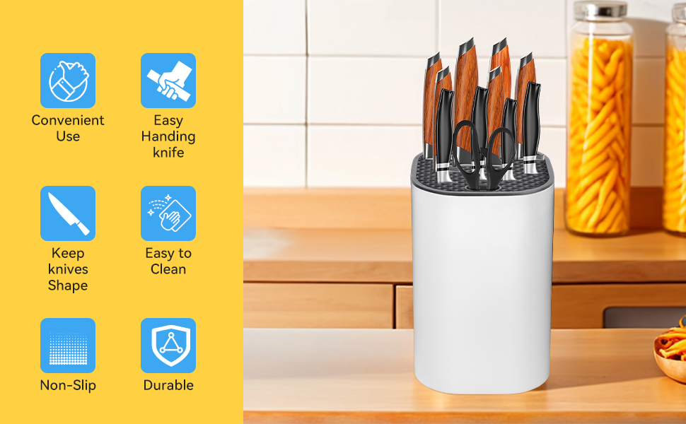 يحافظ على السكاكين حادة: الجزء العلوي المموج ذو الطبقة المزدوجة من البلاستيك المرن يحمل السكاكين بشكل آمن، وفتحات متباعدة بشكل متساوٍ تفصل حواف السكين دون لمس أو خدش بعضها البعض، مما يحافظ بشكل موثوق على حدة الشفرات وجودتها، ويطيل عمر خدمة السكين.