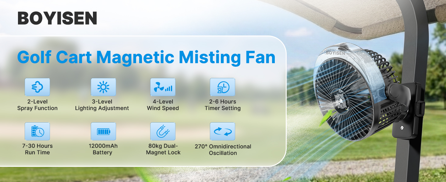 تبريد الرذاذ: تتميز مروحة الرذاذ هذه بخزان مياه سعة 100 مل وتذبذب متعدد الاتجاهات بزاوية 270 درجة، مما يوفر تدفق الهواء والرذاذ بدقة في المكان الذي تحتاجه. يتم تركيبه على عربة الجولف الخاصة بك، وهو يوفر تبريدًا مستمرًا بين الجولات، مما يساعدك على البقاء باردًا ومركزًا أثناء الطقس الحار.