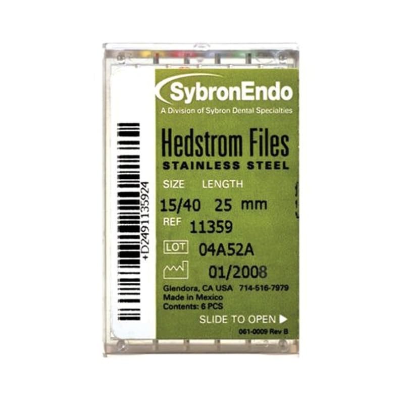 The Kerr Dental SybronEndo Hedstrom Files Stainless Steel 25mm #15-40 Assorted 6/Bx are designed for precise root canal preparation. These high-quality stainless steel files are ground from stainless steel wire, providing durability and flexibility. The flute depth increases with the taper, allowing for a sharper and more effective cutting action. Ideal for use in endodontic procedures, these Hedstrom files are available in a range of sizes (#15-40) and come in a convenient box of 6. Whether you're performing routine root canal treatments or more complex procedures, these files offer superior performance and reliability.