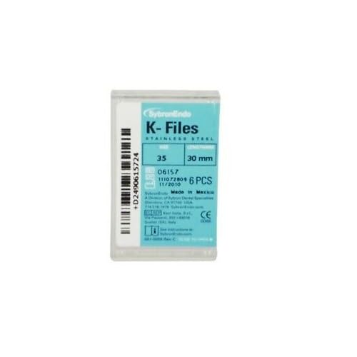 Kerr K-File prides on the highest durability among all other endodontic hand files used during root canal procedures. K-Files have reduced separation capacity and can easily avoid obstructions during instrumentation. K-Files 30mm #35 6/Box. Stainless Steel.