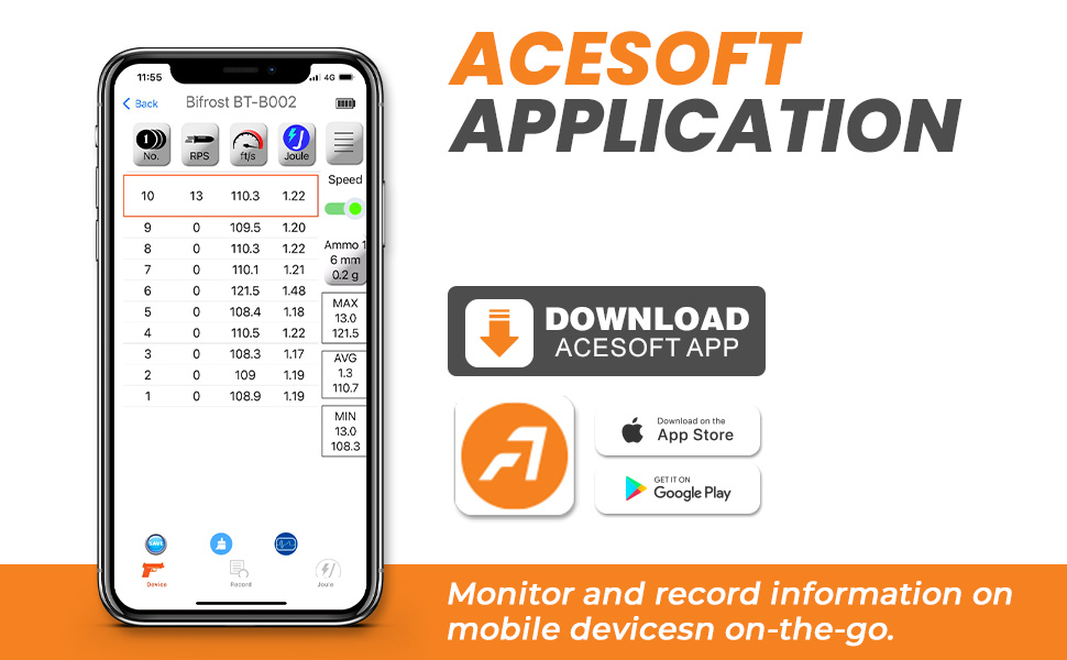 Support Micro-USB (5V/0.5A) power input (no battery charge function) or Use AA Alkaline battery*2 Measures Muzzle Velocity from 30 m/s ~ 400 m/s (90 ft/s ~ 1200 ft/s) Ammo parameter setting supports 5 memory slots Ammo parameter setting from Weight: 0.01g ~ 9.99g Caliber 4.5mm ~ 18mm 25 memory slots for velocity and ROF (Rate of fire) Tripod Ready mounting hole (Screw for standard camera / camcorder tripods ) Support Micro-USB(5V/0.5A) power input(no battery charge function) ROF range: 100~5000RPM Extra large caliber (diameter 24mm) Weight: 200g without battery Size : L x W x H = 117 x 97 x 59 (mm)