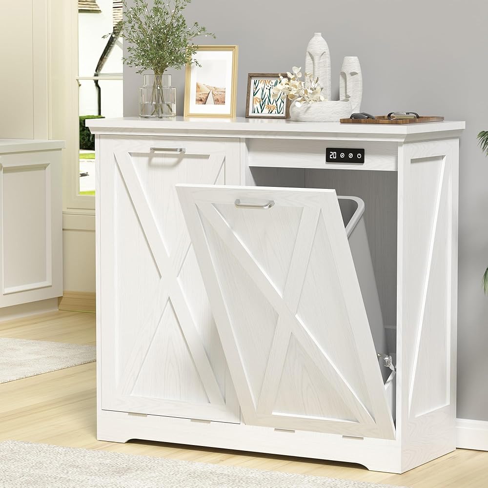 Tolead Tilt Out Trash Can Cabinet with Odor Control and Negative Ion System Elevate your kitchen's cleanliness and style with the Tolead Tilt Out Trash Can Cabinet. This innovative trash solution not only discreetly hides your waste but also neutralizes unpleasant odors thanks to its built-in deodorizing and negative ion system. Ideal for maintaining a fresher kitchen environment. The spacious design fits a 13-gallon trash bin, making it perfect for waste or recycling management in any home. Its tilt-out feature offers easy access while keeping your kitchen tidy and organized. The cabinet is crafted from durable MDF, ensuring long-term stability. The top surface, supporting up to 150 lbs, can serve as extra storage or even as an additional workspace. Featuring a sleek white wood grain finish and silver arc handles, this cabinet adds a modern touch to any kitchen, dining room, or living room. Its raised feet make cleaning under the cabinet easy, and the wide countertop provides additional storage space for everyday items. Easy to assemble with pre-drilled holes and straightforward instructions, this trash cabinet ensures a hassle-free setup. Designed for functionality and style, it's the perfect addition to your home, offering both efficient waste management and a modern aesthetic.