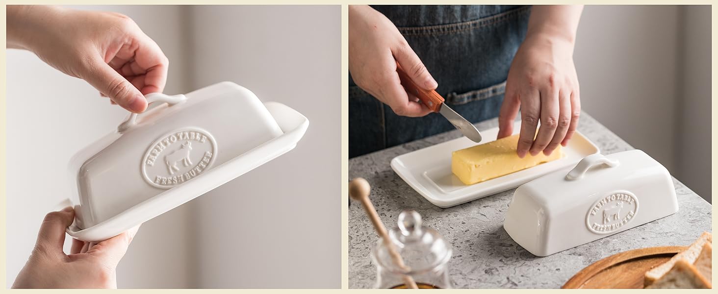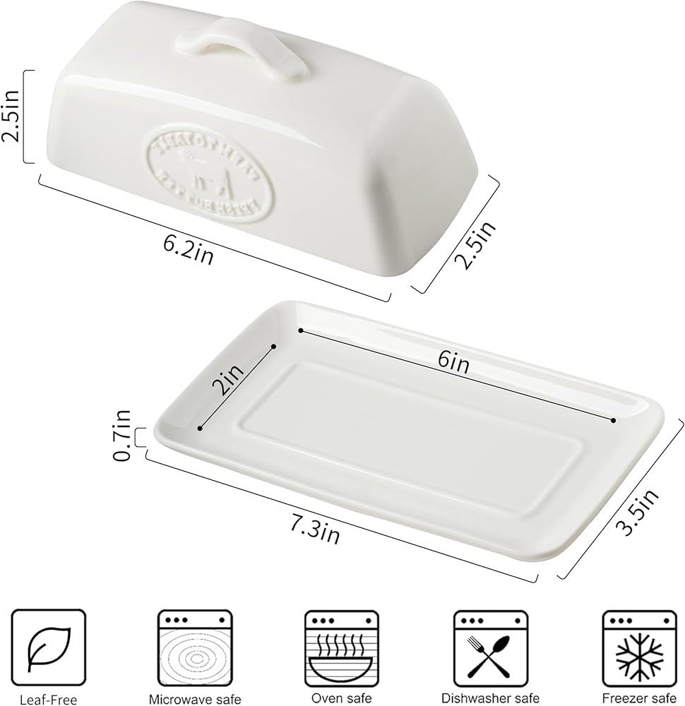 بورسلين فاخر: مصنوعة من السيراميك القوي، حاوية حامل الزبدة الخاصة بنا مصممة لتدوم طويلاً، وتوفر متانة طويلة الأمد وسهولة الصيانة للاستخدام اليومي.