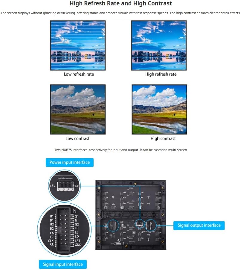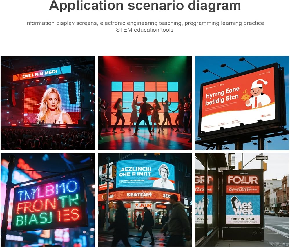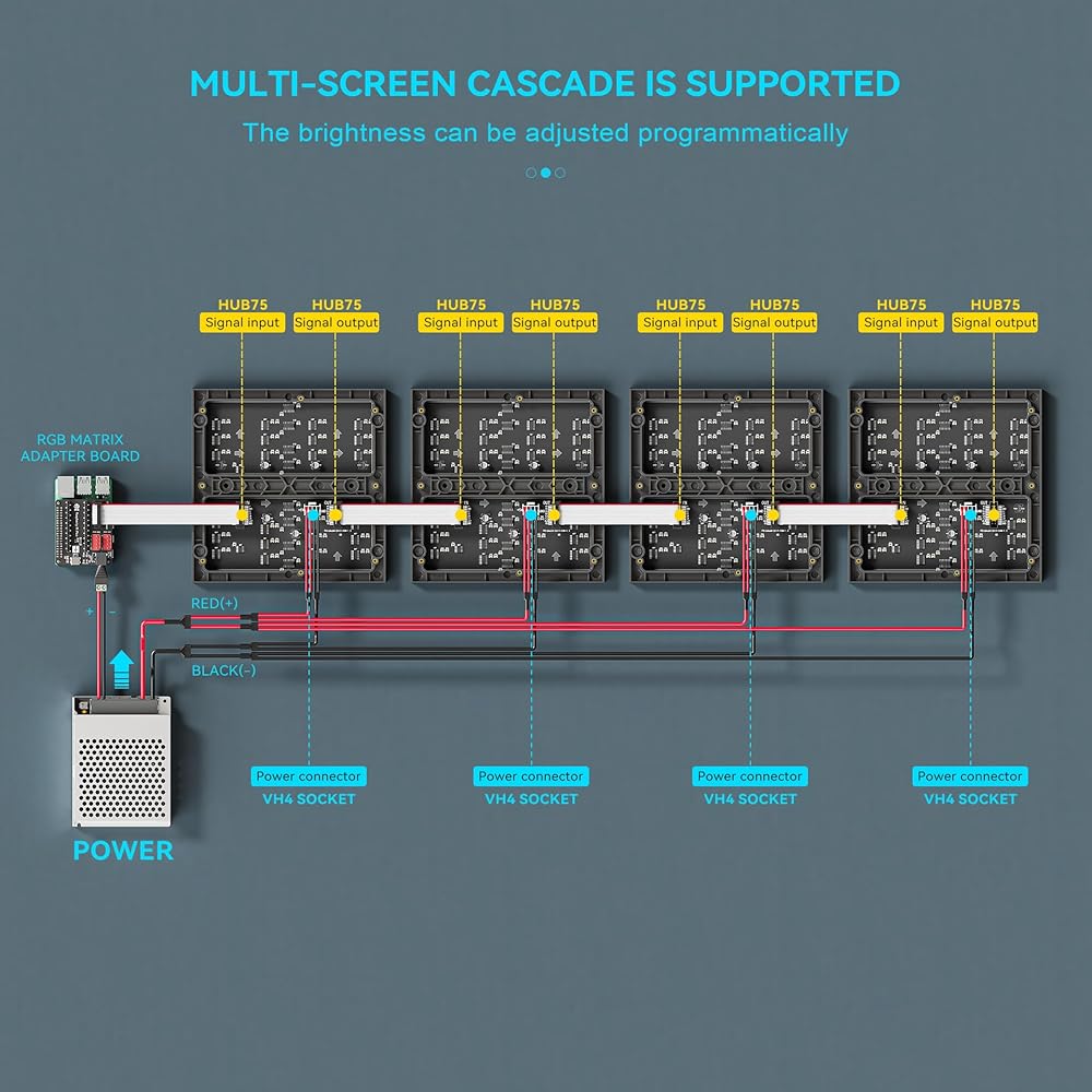 تصميم قابل للتوسيع: واجهات HUB75 مزدوجة لتتالي الشاشات المتعددة بسهولة (يتطلب 5 فولت/4 أمبير لكل لوحة).