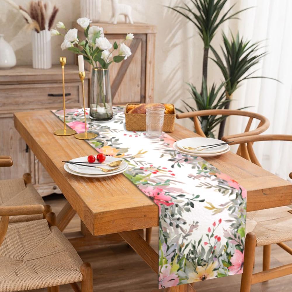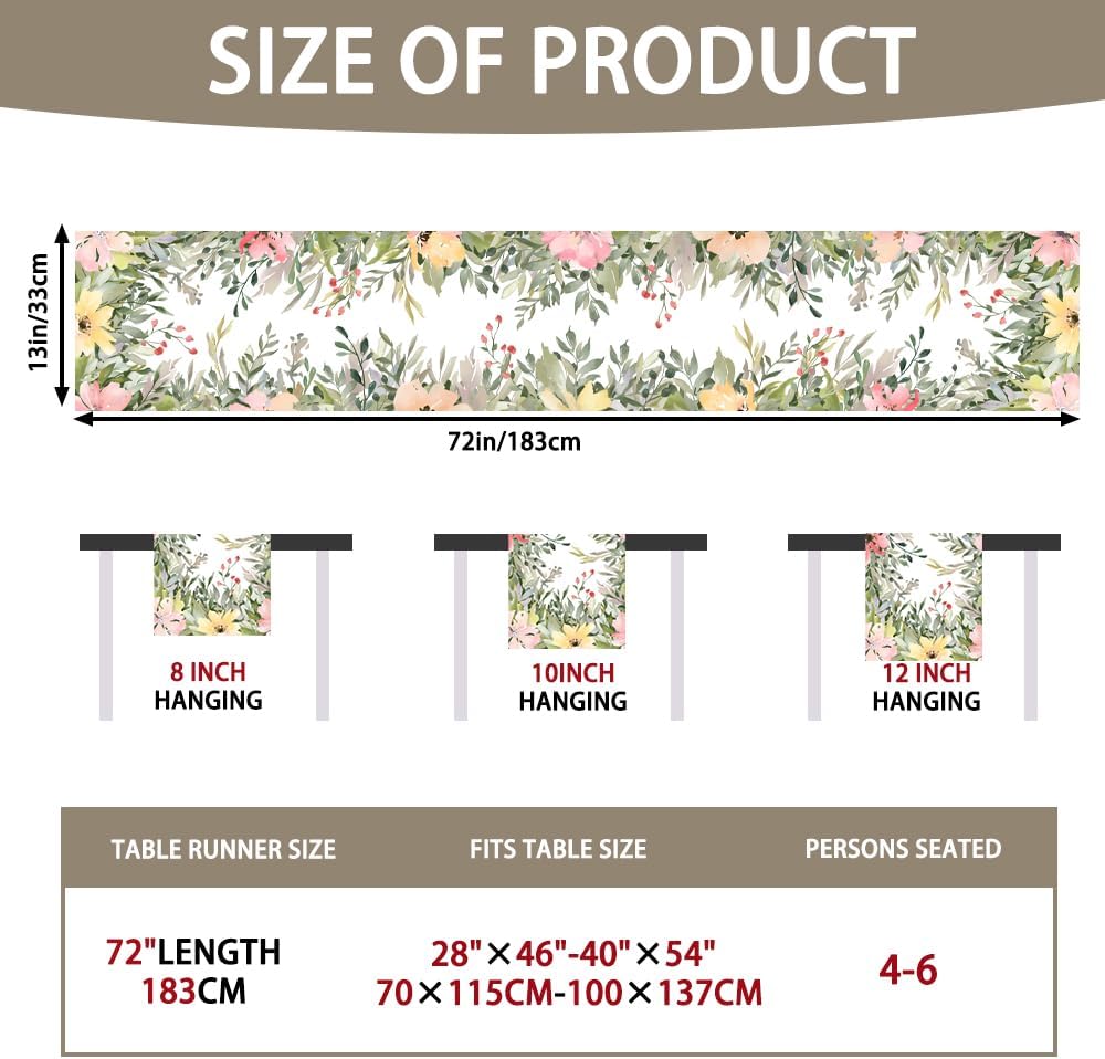 Ideal Size: The watercolor flowers spring table runner is 13x72 inch, appropriate for a table that can seat 4-6 people. It's perfect for family gatherings, giving you, your family and guests an enjoyable and impressive dining experie.