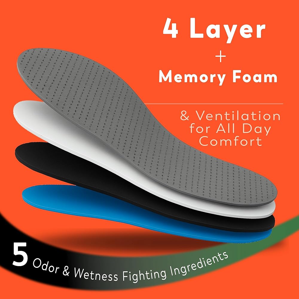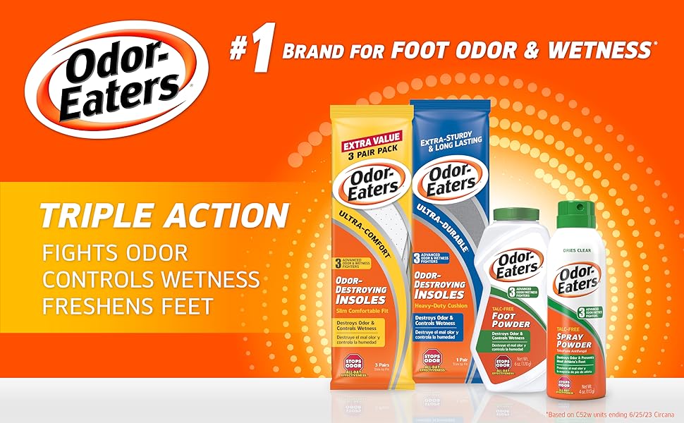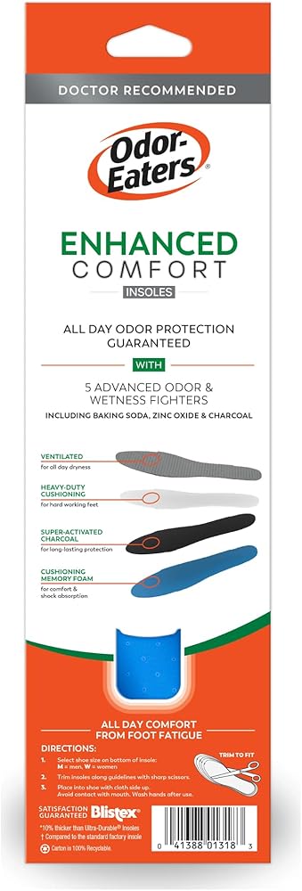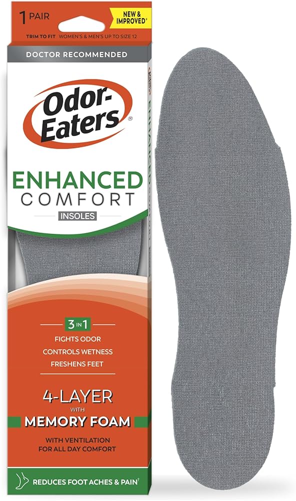 Odor-Eaters Enhanced Comfort Insoles offer 4-Layer with Memory Foam Comfort + Guaranteed All-Day Odor Protection. Specially designed to reduce pressure for hard-working feet, Odor-Eaters® Enhanced Comfort Insoles deliver powerful odor control, all day support, and fatigue-fighting cushioning backed by over 50 years of trusted foot health expertise. Built for anyone who spends long hours on their feet, Odor-Eaters® Enhanced Comfort Insoles combine 4 layers of advanced cushioning, memory foam softness, and 5 odor & wetness fighters to keep feet fresher, drier, and more comfortable all day. Doctor recommended brand and scientifically proven to reduce foot odor; these insoles start working immediately - helping relieve pressure, provide comfort from foot fatigue. These insoles support active, on-the-go lifestyles while delivering Odor-Eaters' trusted 3-in-1 protection: Fights Odor, Controls Wetness, Freshens Feet. Designed with a ventilated top cover for breathable dryness plus heavy-duty cushioning for hard-working feet, Enhanced Comfort Insoles help you stay on your feet longer with every step. They also help provide all day comfort from foot fatigue. Engineered for anyone who wants more comfortable steps, drier feet, and long-lasting odor protection, our 3-in-1 insoles work immediately to fight foot odor, control wetness, and freshen feet all day, every day while adding comfort to every step.