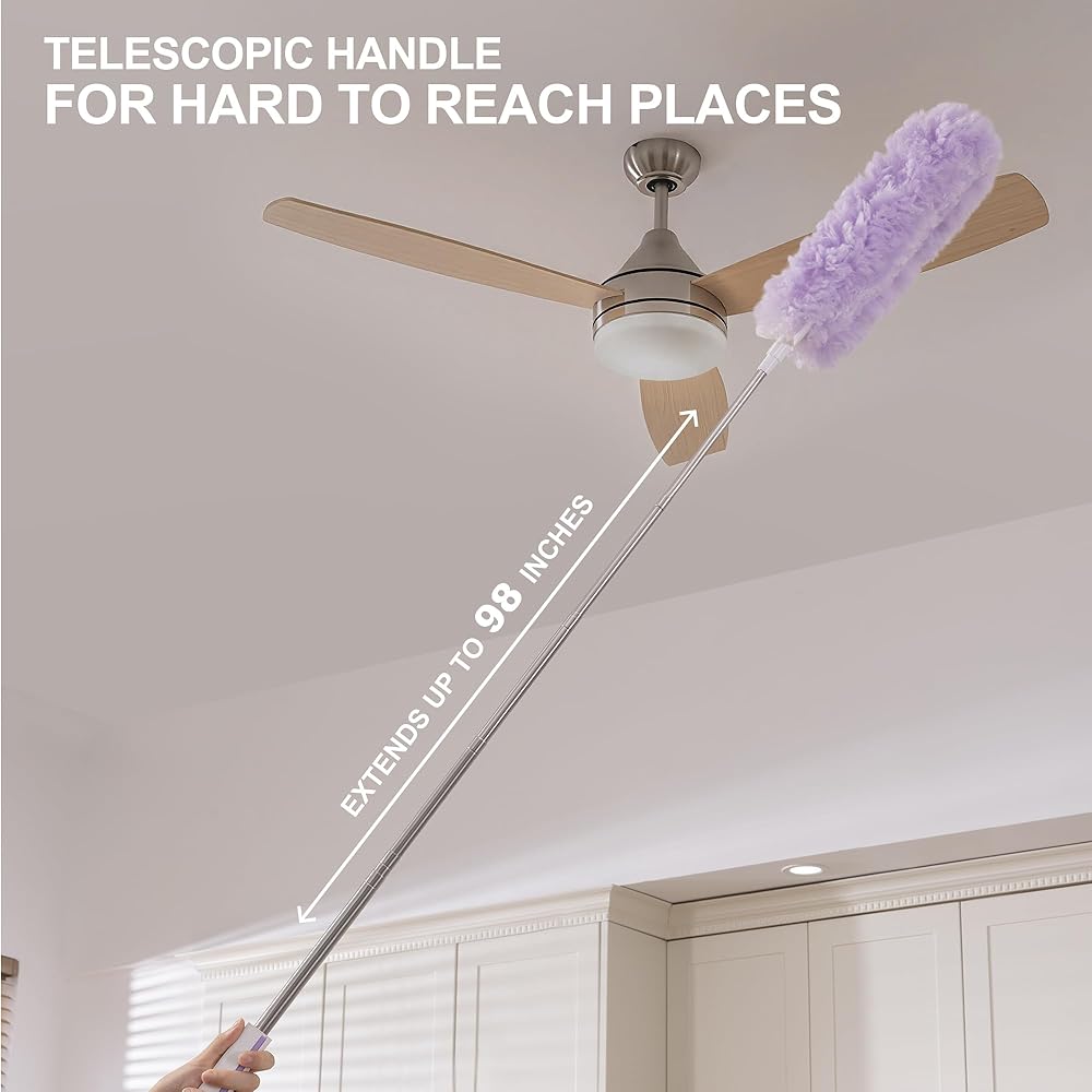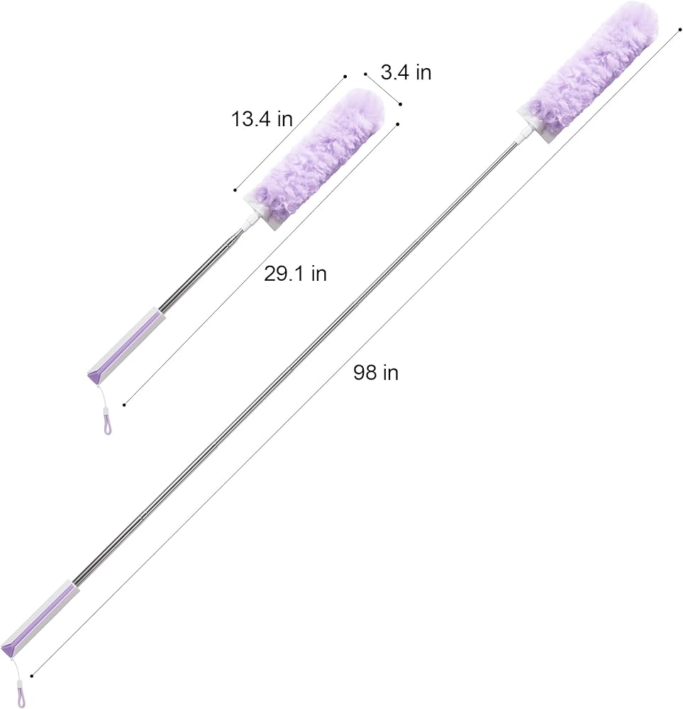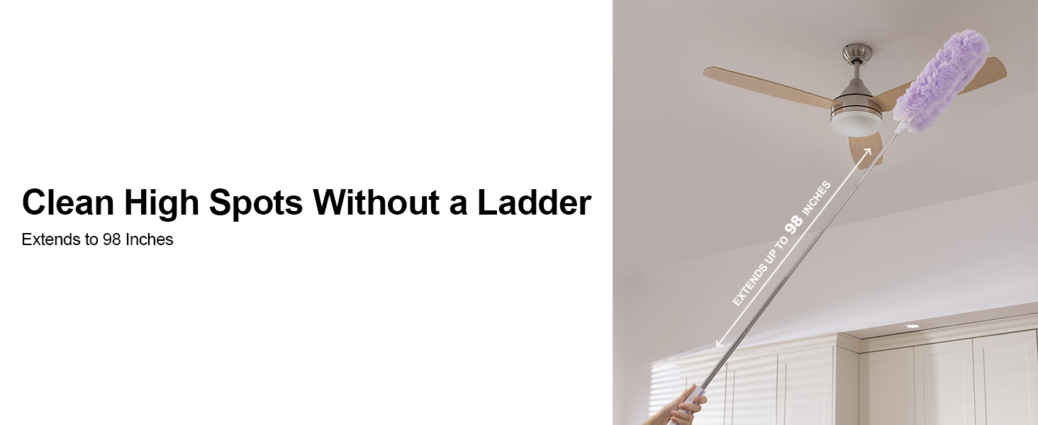 [الأماكن التي يصعب الوصول إليها من الغبار] يمكن تعديل المقبض القابل للتمدد من 28 بوصة إلى 98 بوصة، مما يجعل من السهل تنظيف المناطق المرتفعة والمنخفضة دون الحاجة إلى الكراسي أو السلالم