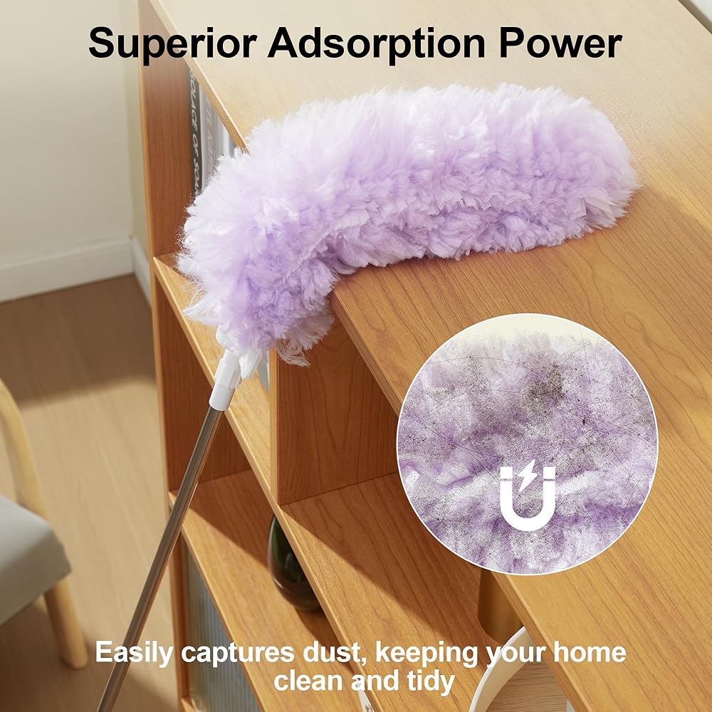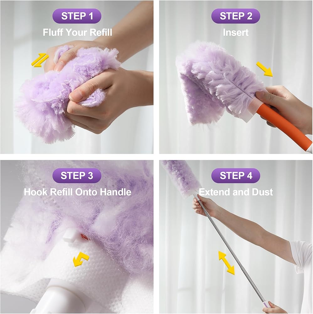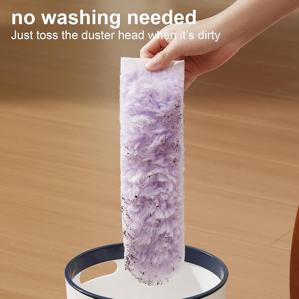 [سهلة الاستخدام] تتضمن 6 عبوات وتأتي مع مكشطة يمكن وضعها على المقبض. ما عليك سوى كشطها لأعلى لتنفض ألياف المنفضة وتعزيز الكهرباء الساكنة لالتقاط الغبار بشكل أفضل، ثم اكشطها للأسفل لإزالة الغبار والشعر بسرعة من رأس المنفضة