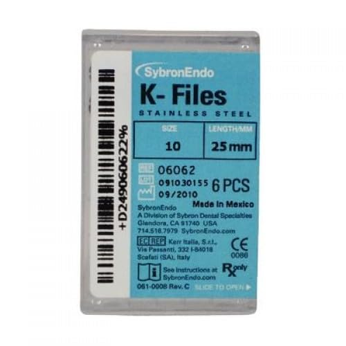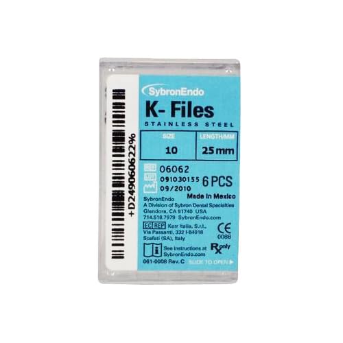 The Kerr Dental SybronEndo Stainless Steel Endodontic K-Files are designed for precision and reliability during root canal treatments. These K-Files are the strongest hand files available, offering superior strength to bypass obstructions with ease. Their square cross-sectional shape allows for efficient root canal cleaning, shaping, and unclogging. Made from premium stainless steel, these files are durable, fracture-resistant, and provide a smooth tactile feel during instrumentation, ensuring optimal control for dental professionals. The color-coded plastic handles with ergonomic grooves further enhance ease of use and grip, making these files essential for high-quality endodontic procedures.
