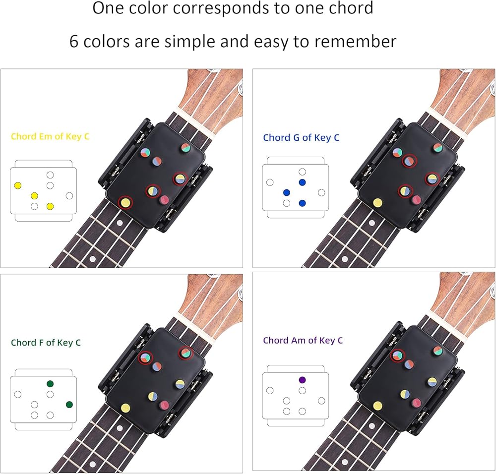 Intuitive Colors: There are 6 colors on the ukulele chord assist, each corresponding to a chord. You can use visual association to remember finger positions faster, the ukulele chord presser can make complex chord learning simpler and more intuitive