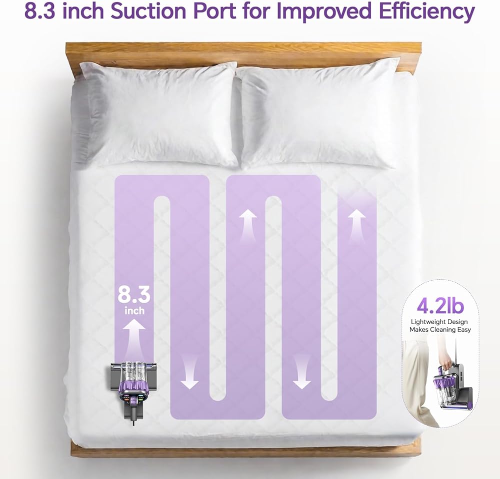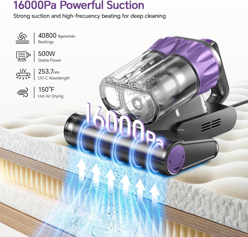【تسخين بدرجة حرارة عالية من أجل النضارة】قوة ثابتة بقدرة 500 وات. مجهزة بتسخين بدرجة حرارة عالية تصل إلى 150 درجة فهرنهايت، تعمل مكنسة المرتبة هذه على تجفيف الفراش وإزالة الرطوبة منه، مما يجعلها جافة ورقيقة مع الحفاظ على النضارة المثالية.