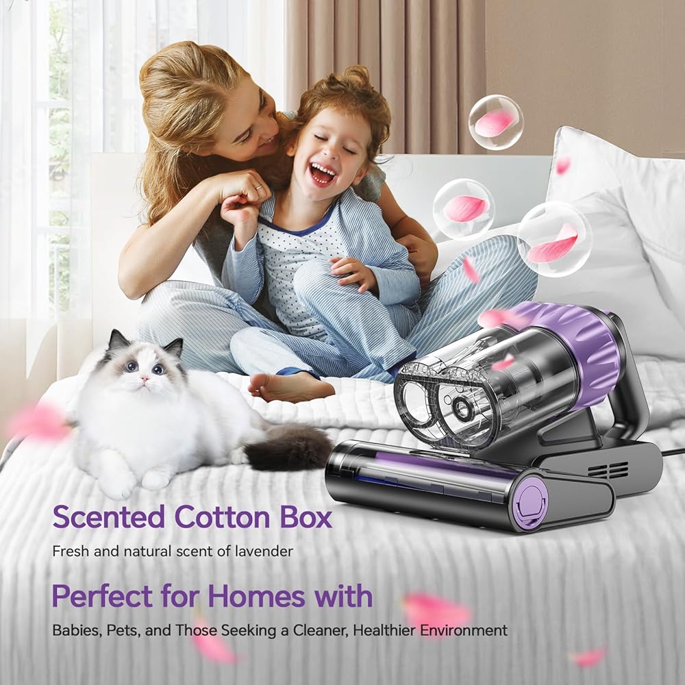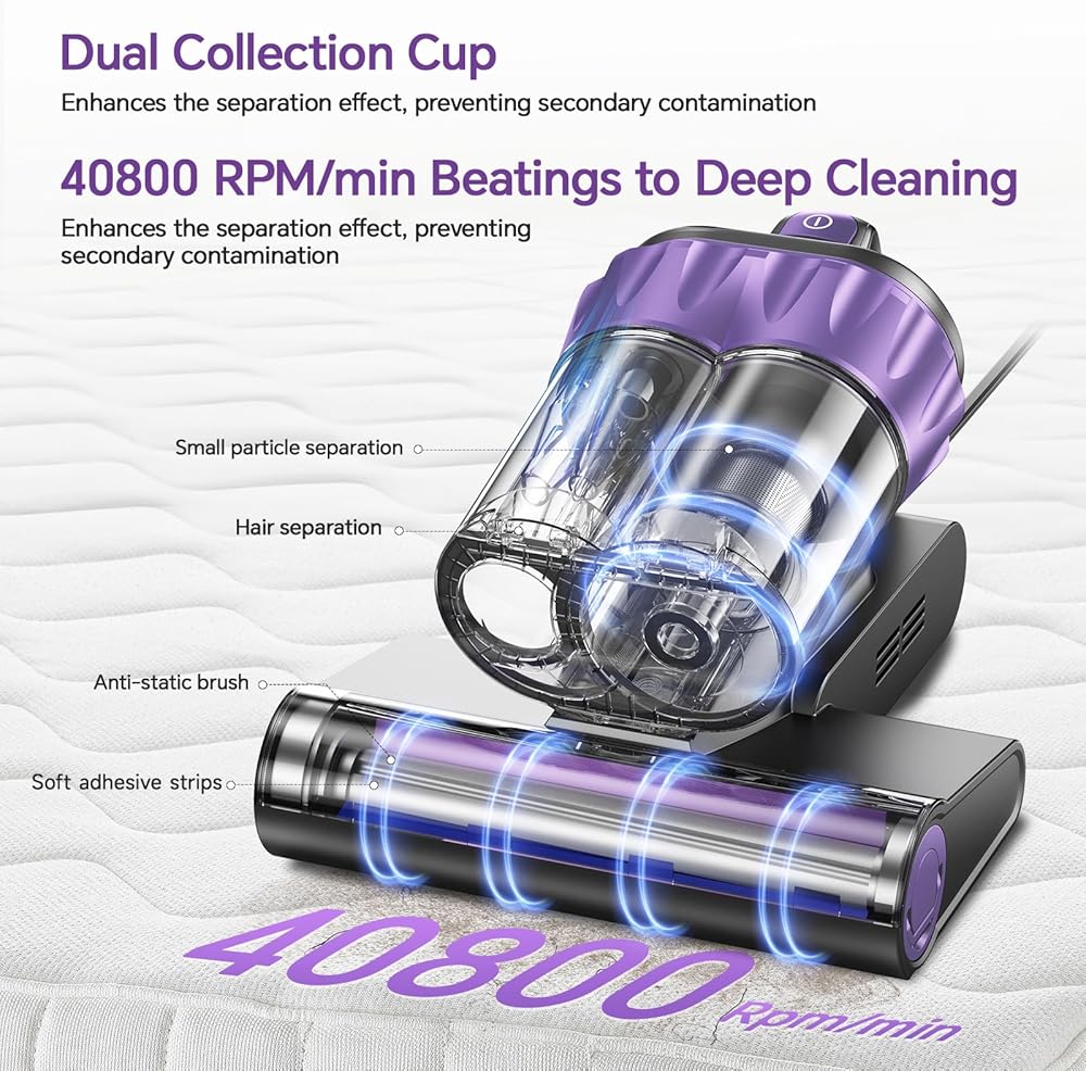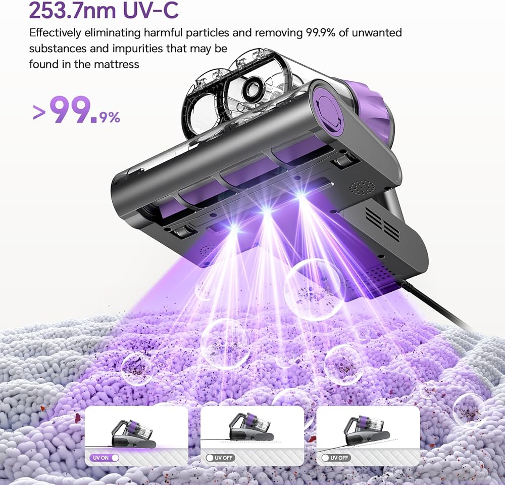 مكنسة كهربائية للمراتب، مكنسة كهربائية للسرير بقوة 18 كيلو باسكال مع ضوء 253.7 نانومتر للأشعة فوق البنفسجية، وحرارة 150 درجة فهرنهايت، وفلتر HEPA والموجات فوق الصوتية، مكانس محمولة متعددة الاستخدامات للسرير والأريكة والأريكة وأفكار هدايا الأطفال للنساء