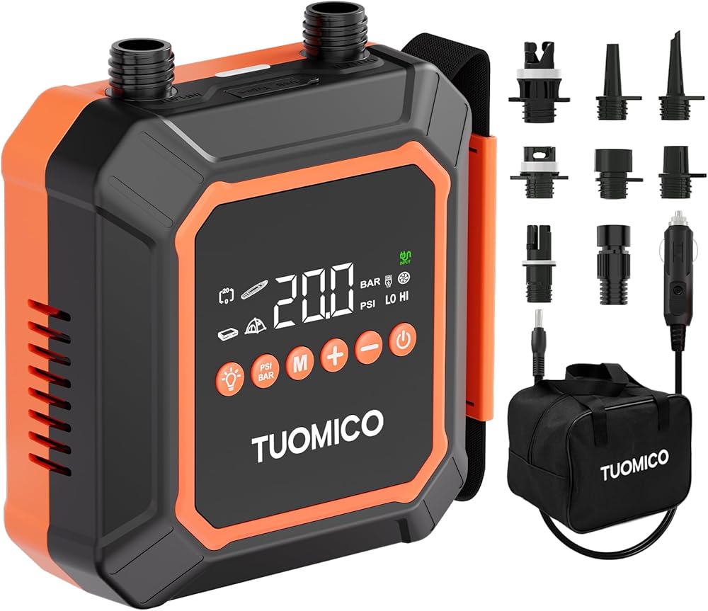 The Tuomico electric paddle board pump takes the effort out of inflating your water sports equipment. This compact air compressor delivers an impressive 20PSI of high pressure, making it powerful enough to inflate SUPs, inflatable paddleboards, kayaks, boats, kites, tents, and dinghies with ease. Its intelligent auto-off feature monitors pressure levels and automatically stops inflation when your desired PSI is reached, preventing over-inflation and ensuring your equipment is ready for action. The digital display clearly shows pressure readings in both BAR and PSI units, giving you precise control over inflation. This pump comes with multiple nozzle attachments to fit various valve types, making it a versatile solution for all your inflation needs. Whether you're at the beach, lake, or campsite, this compact and lightweight pump makes setup quick and effortless, so you can spend more time enjoying your outdoor adventures.