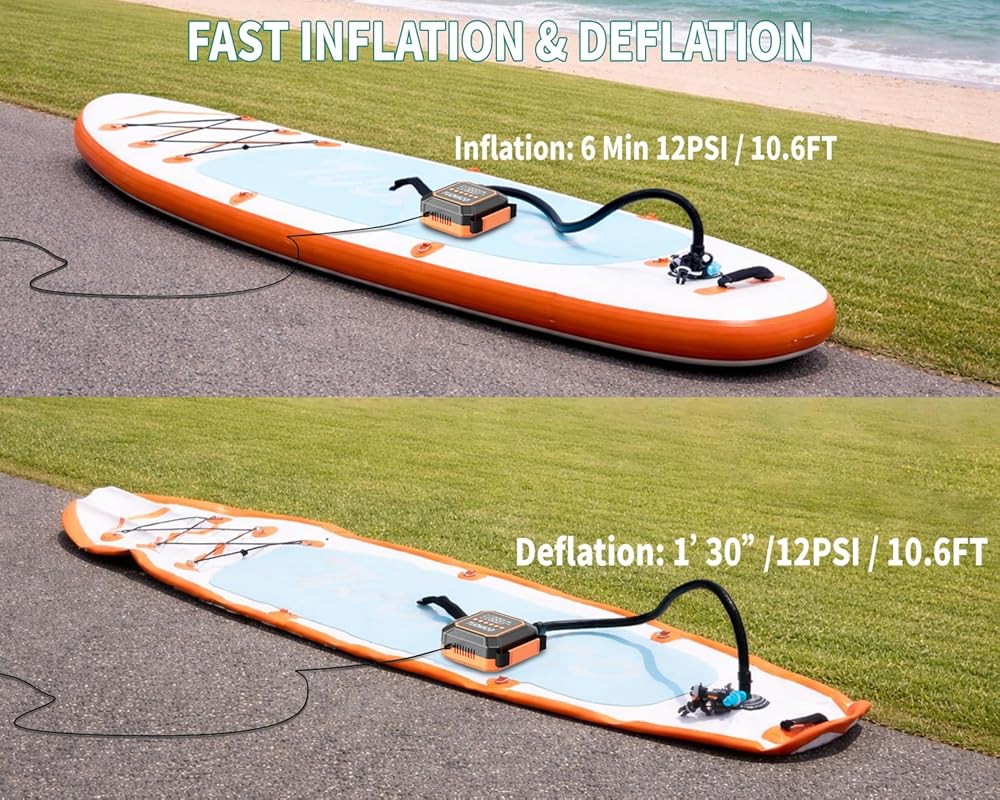 • Fast Inflation & Deflation: the electric paddle board pump can inflate a 10.6FT paddle board to 12PSI in 6 MIN and fully delate in 1'30”! -50% faster than the market average-Making setup and takedown a breeze for all users.