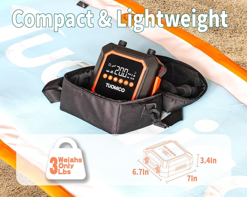 • Lightweight & Portable: With a dimension of 7in x 6.7in x 3.4in (LWH), Weighs only 3Lbs -making it incredibly portable and easy to carry. The sup pump electric comes with a convenient handle and nice carrying bag, making it possible to put the pump and the accessories in and no worrying about losing any parts. Perfect for water adventure and camping.