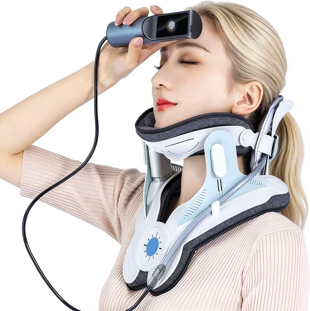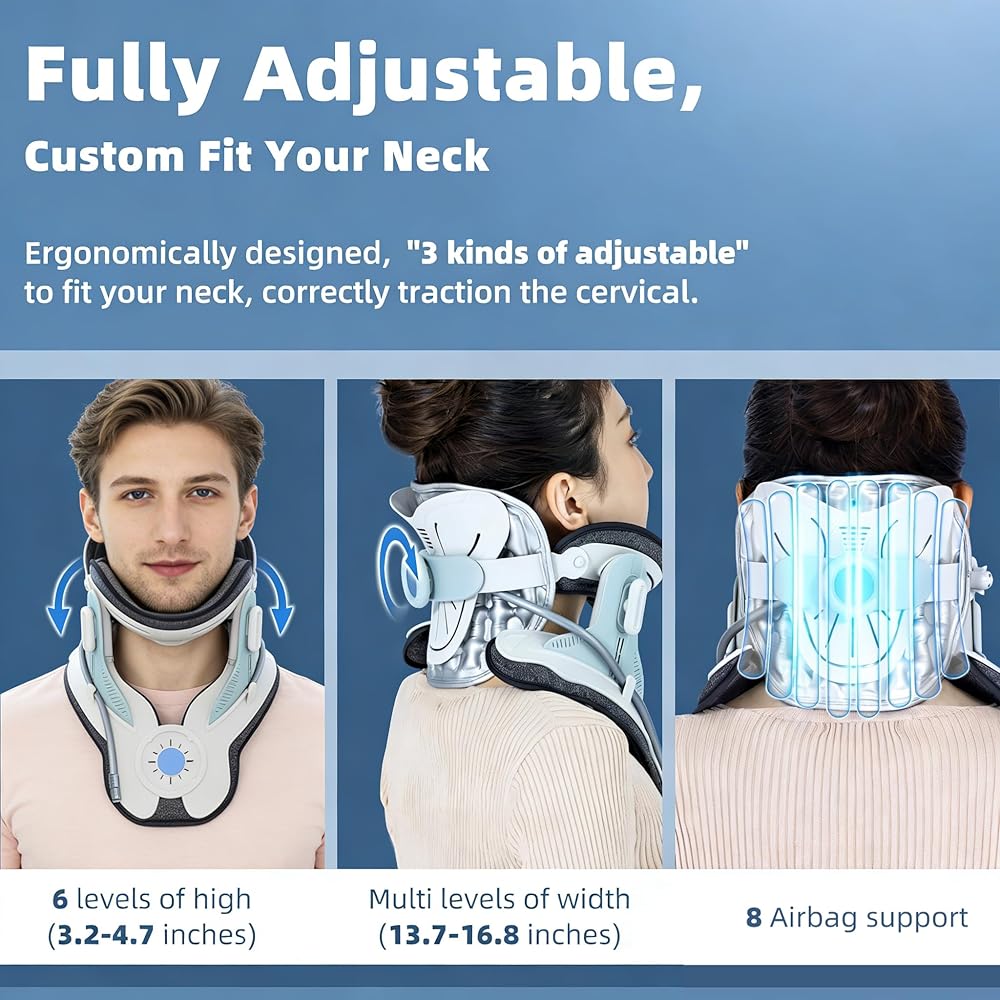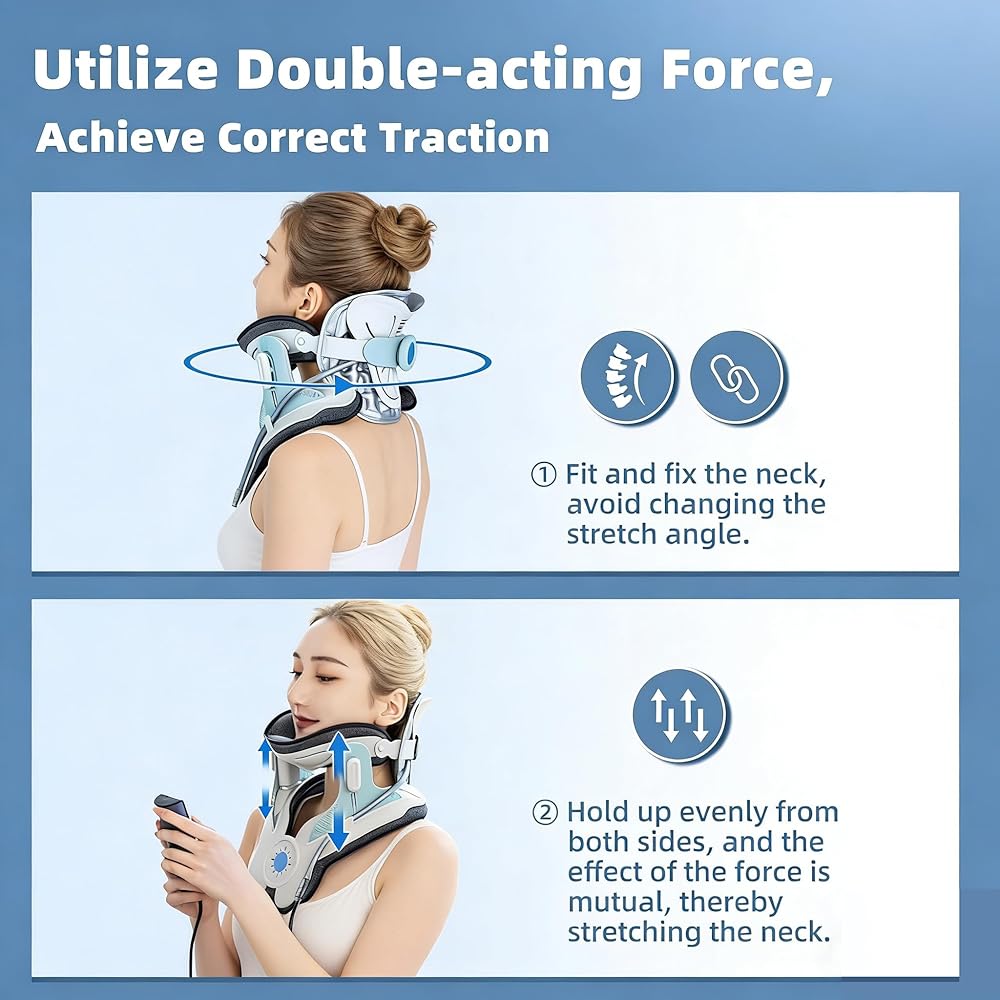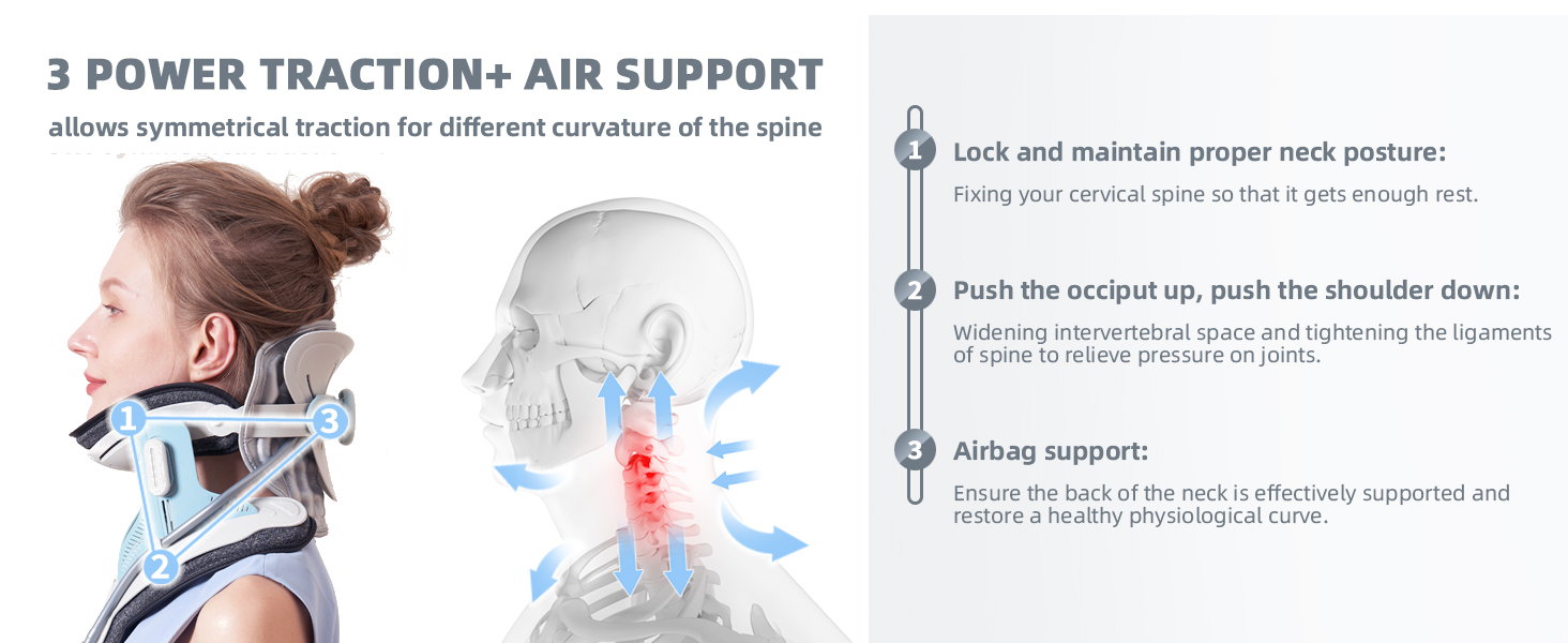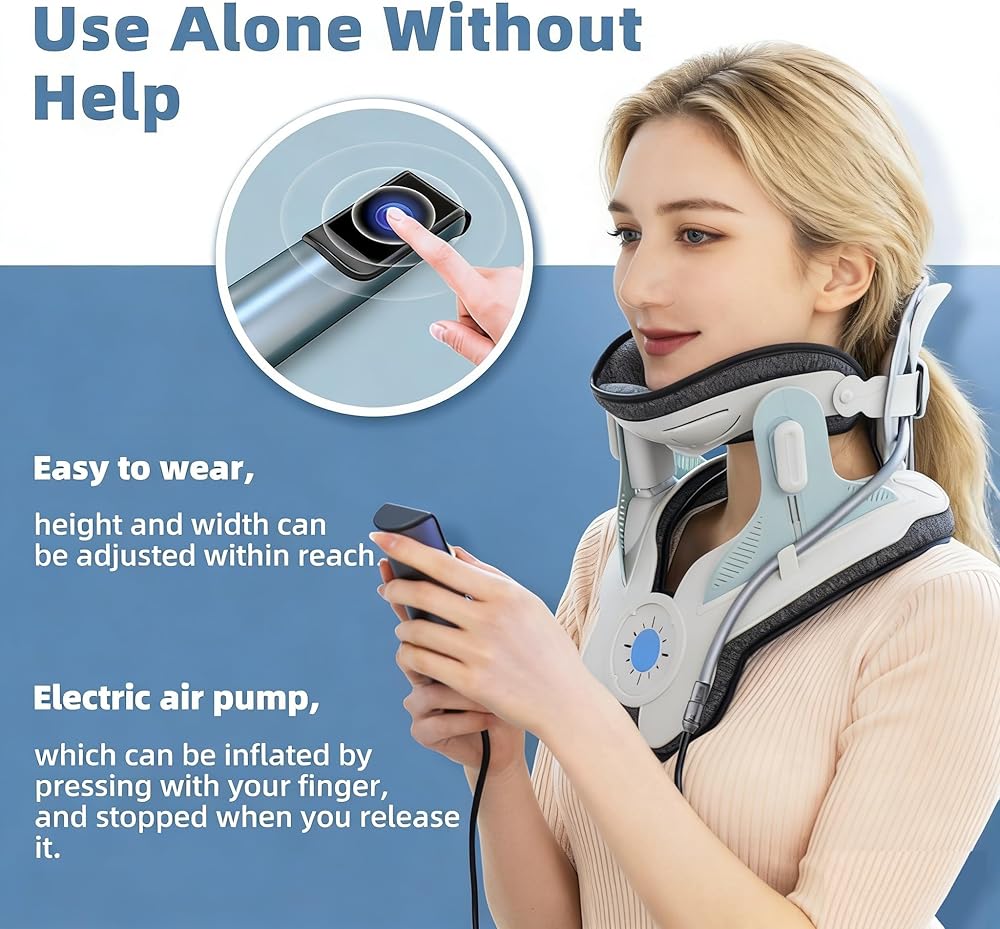 【مضخة هواء كهربائية للتمدد بدون مجهود】قل وداعًا للضخ اليدوي. مع النفخ الكهربائي بلمسة واحدة، يوفر الجهاز سحبًا ثابتًا وتدريجيًا، ويرفع رأسك بلطف دون قوة مفاجئة أو إزعاج. إنه مثل امتداد يشبه السحابة لرقبتك.