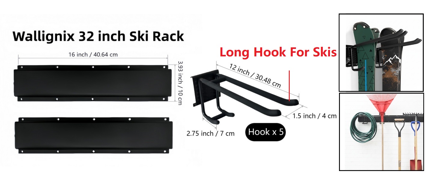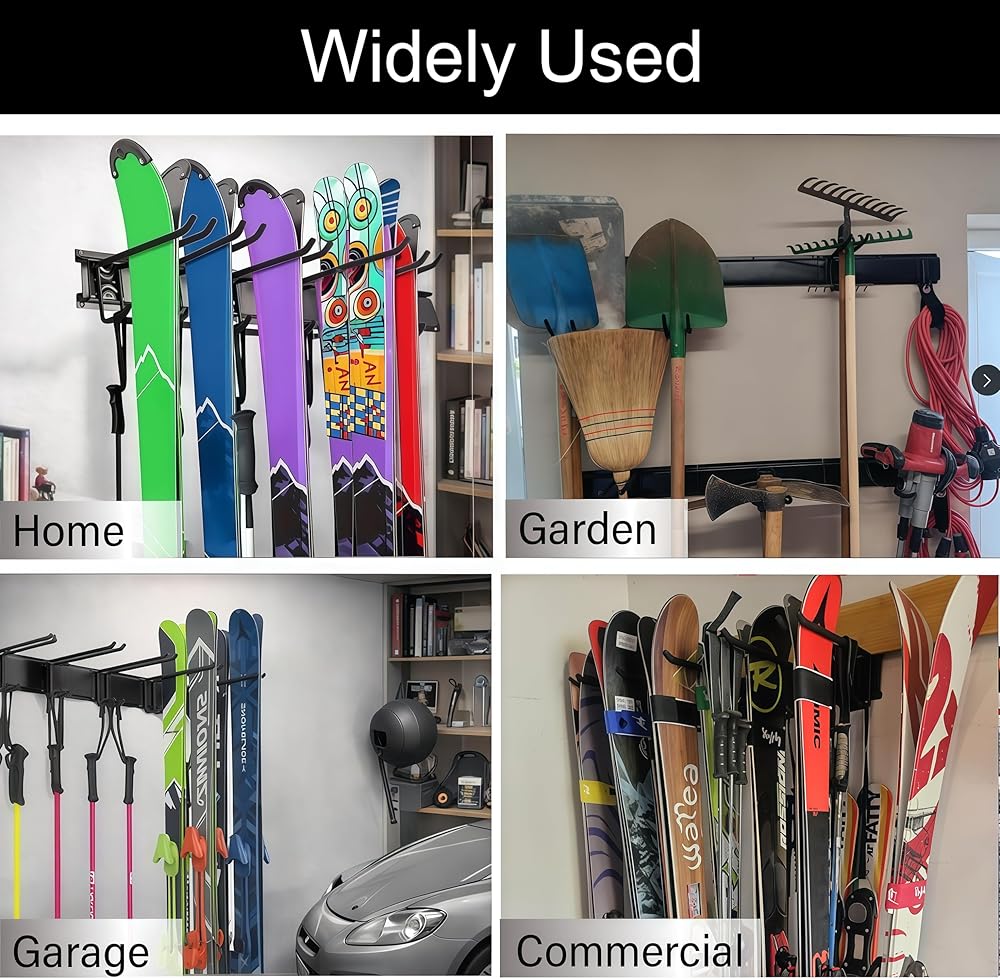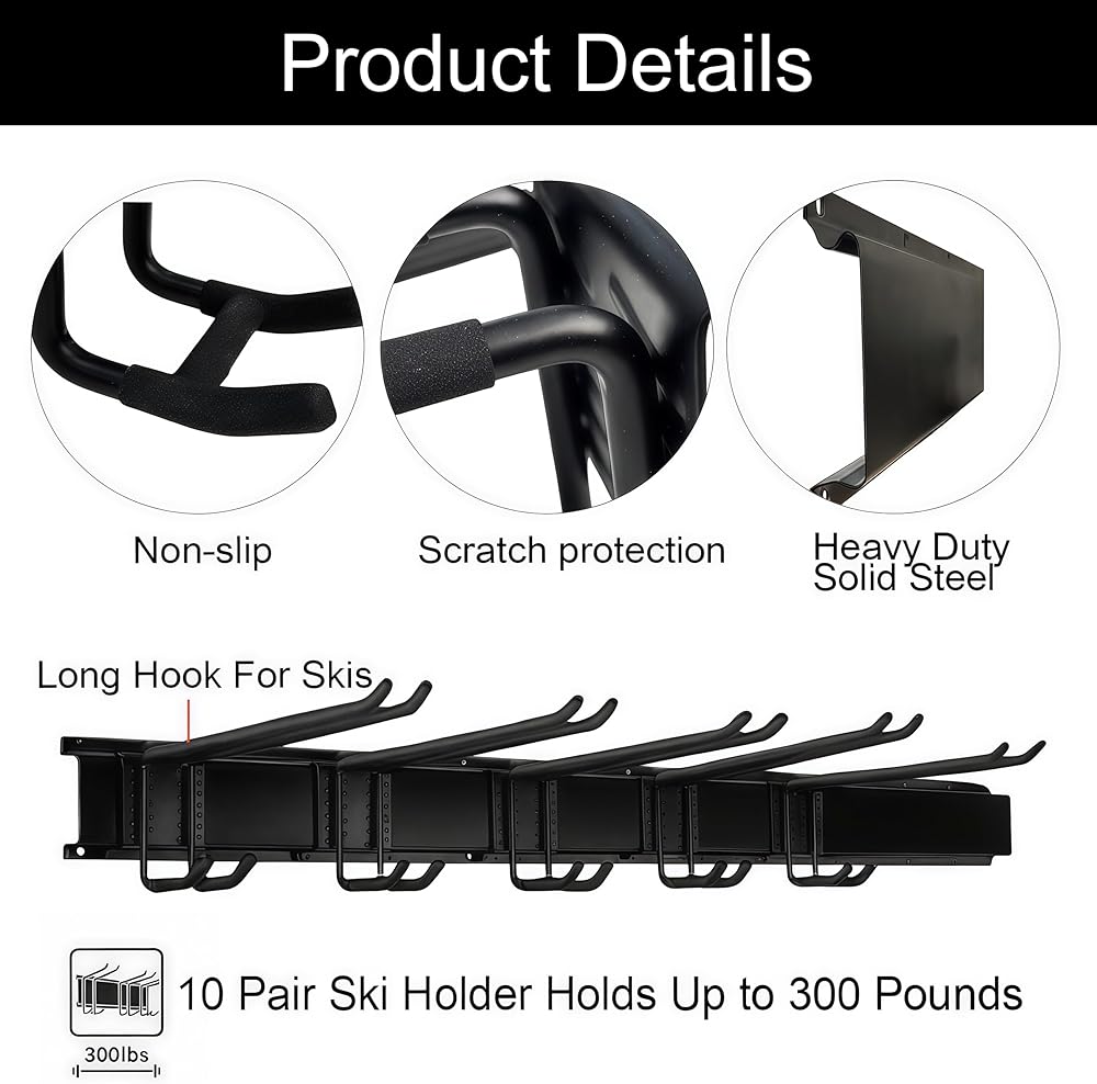 【سعة تخزين معدات التزلج شديدة التحمل 10 أزواج】حل تخزين ضخم: يشتمل على قضبان مقاس 16 بوصة (إجمالي 32 بوصة) و5 خطافات شديدة التحمل قابلة للتعديل مقاس 12 بوصة. تم تصميمها خصيصًا لتحمل ما يصل إلى 10 أزواج من الزلاجات بشكل آمن، مما يؤدي على الفور إلى إزالة الفوضى في المرآب أو المنزل أو شقة التزلج.