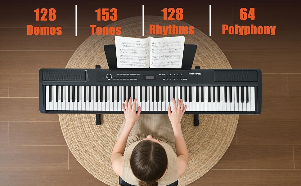 【جودة صوت رائعة】: قام البيانو الرقمي MSTNE بتطوير مصادر صوت DREAM الفرنسية عالية الجودة ومكبرات صوت استريو مدمجة بقدرة 15 وات، مما يوفر جودة صوت أكثر واقعية وأكثر ثراءً ونغمات أكثر ثراءً. تتميز لوحة المفاتيح المكونة من 88 مفتاحًا بـ 128 أغنية تجريبية، و153 نغمة، و128 إيقاعًا حاضرًا، و64 بوليفونيًا. فهو يوفر لك تجربة عزف بيانو أصلية ويوفر مساحة واسعة للإبداع وتحسين المهارات.