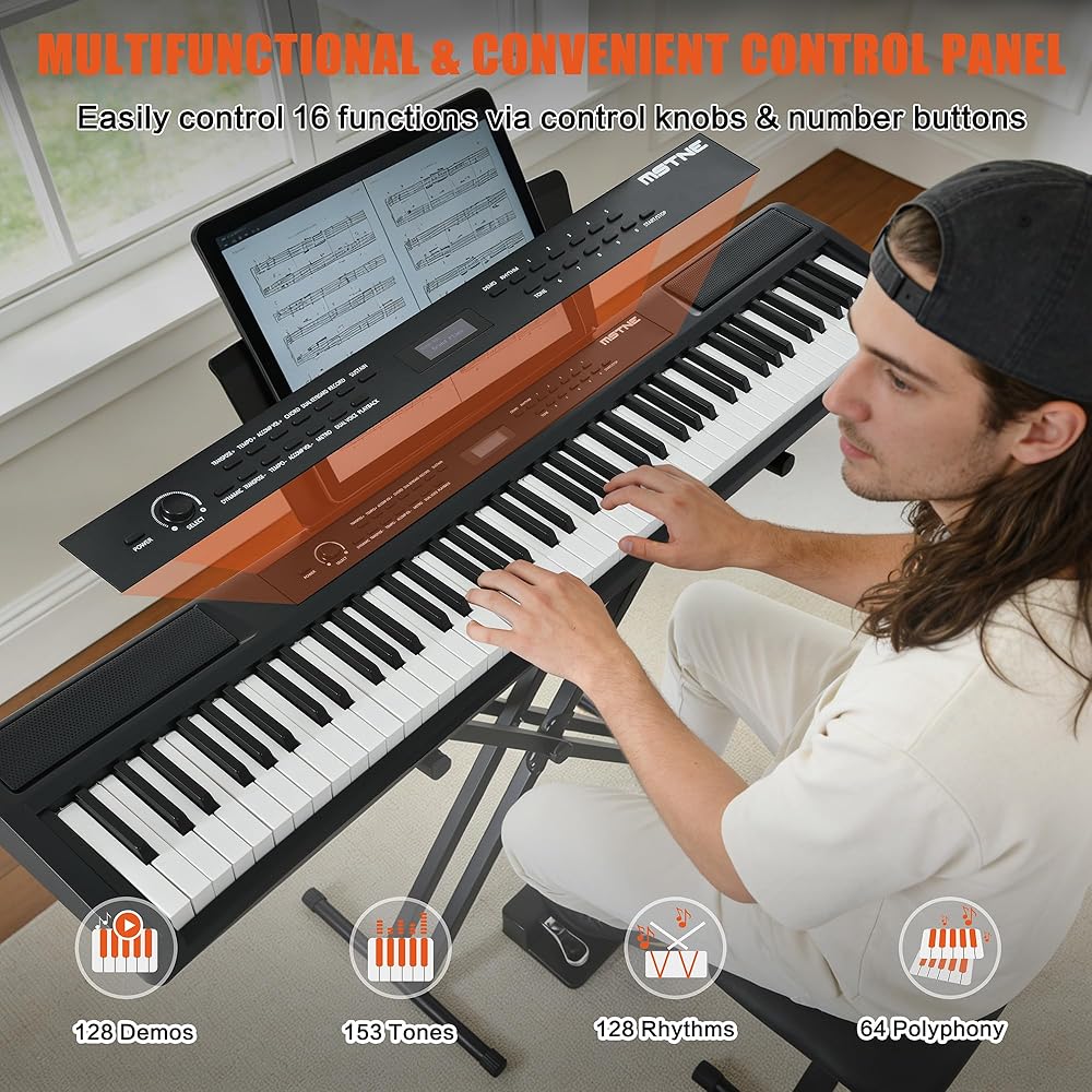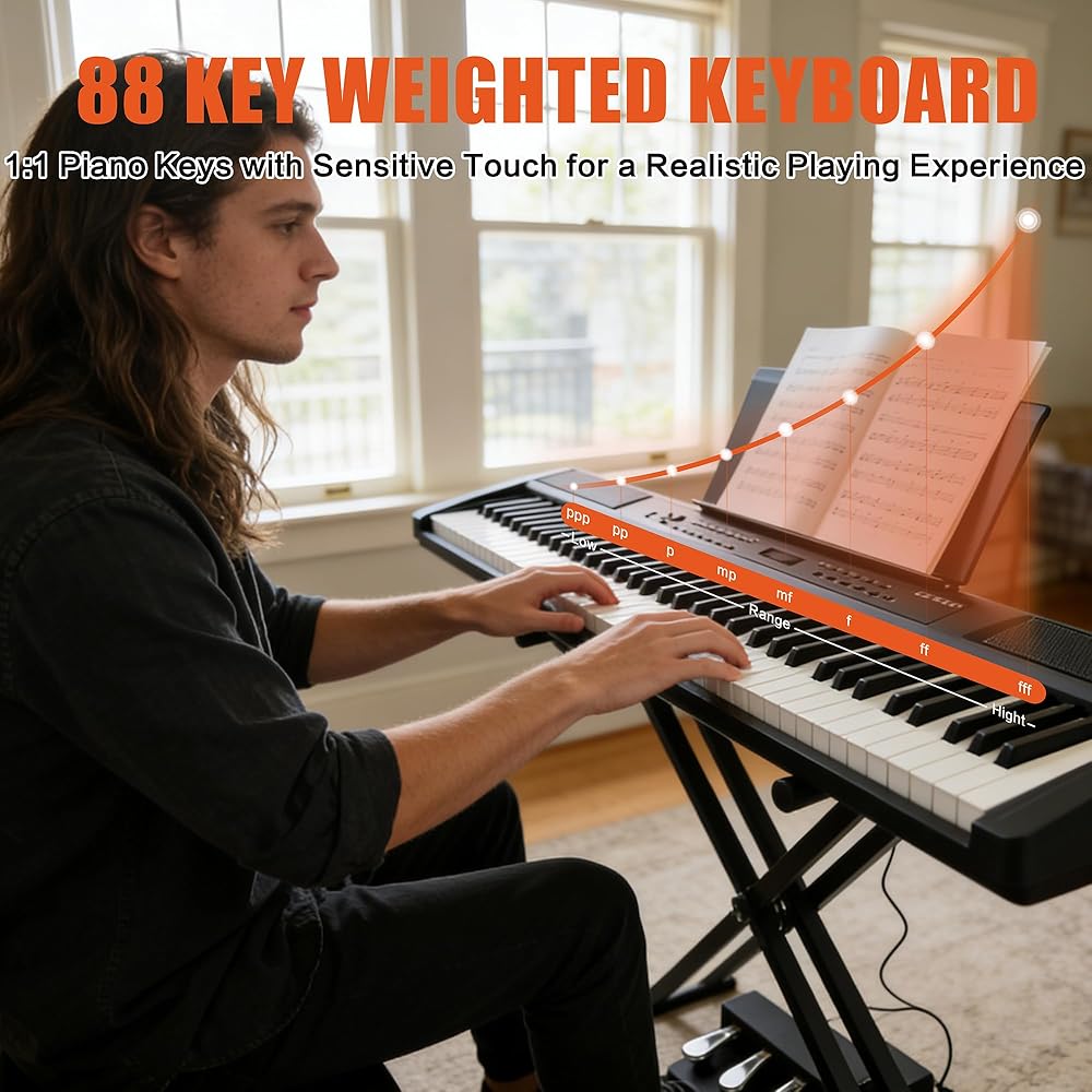 【لوحة مفاتيح بيانو مرجحة بـ 88 مفتاحًا】: هذا البيانو الرقمي شبه الموزون مزود بلوحة مفاتيح حساسة للمس، ويلتقط بدقة قوة أصابعك ويمنحك لمسة بيانو كبيرة. بالمقارنة مع لوحة المفاتيح الموزونة بالكامل، فهو يتميز بعودة أسرع ولمسة أخف، مما يجعله خيارًا مثاليًا للمبتدئين.