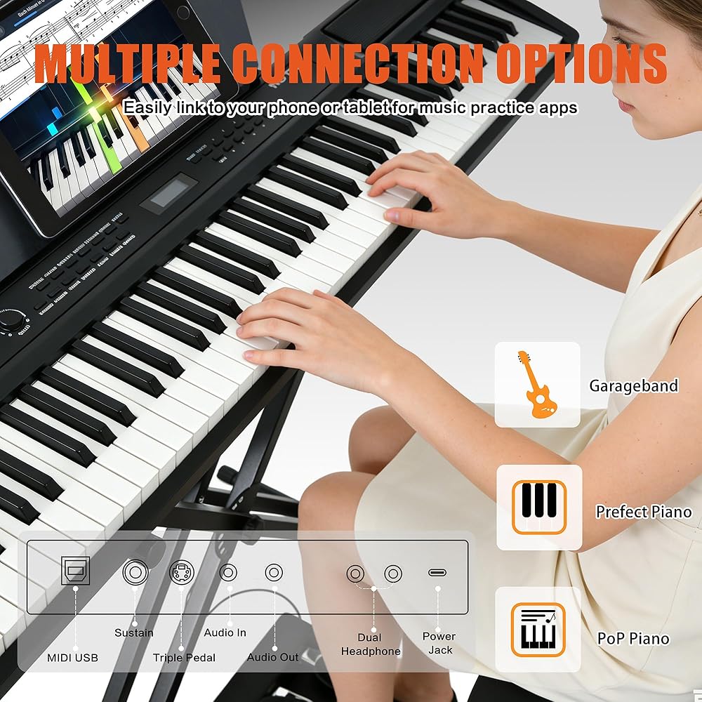 【اتصال ذكي】: يمكن لبيانو لوحة المفاتيح الكهربائية هذا الاتصال بسهولة بأجهزة مثل الهواتف المحمولة وأجهزة الكمبيوتر اللوحية عبر MIDI-USB وBluetooth، وهو متوافق مع تطبيقات ممارسة الموسيقى مثل POP Piano وPerfect Piano. يتيح لك تصميم مقبس سماعة الرأس المزدوج توصيل زوجين من سماعات الرأس في وقت واحد، مما يضمن عدم إزعاج الآخرين أثناء ممارسة الموسيقى أو الاستمتاع بها.