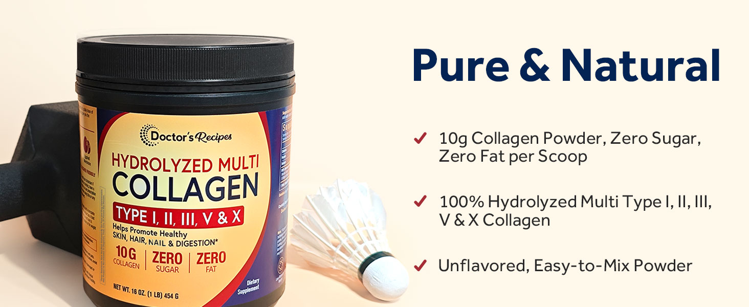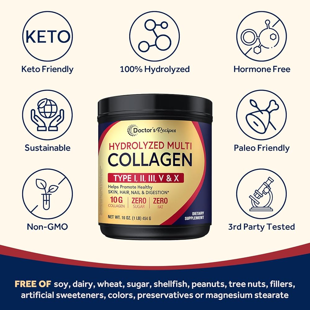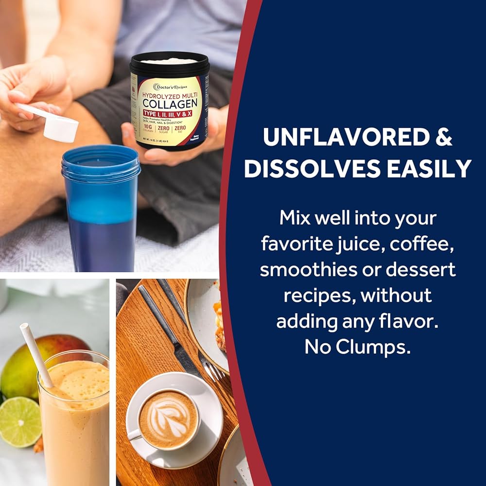 مسحوق ببتيدات الكولاجين المتعدد للنساء والرجال من دكتور وصفات، بروتين متحلل من الأبقار التي تتغذى على العشب من النوع I II III V X، للبشرة والشعر والأظافر، بدون نكهة، سهل الذوبان، باليو وكيتو، 16oz