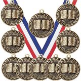 الأشرطة متضمنة: تشتمل كل واحدة من ميداليات الجوائز العشر على شريط رقبة قياسي بعرض 7/8 بوصة باللون الأحمر والأبيض والأزرق مع مشبك سهل الإطباق.