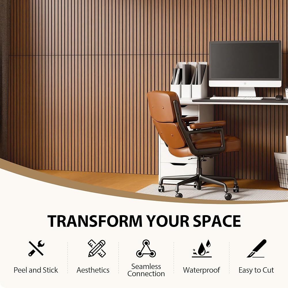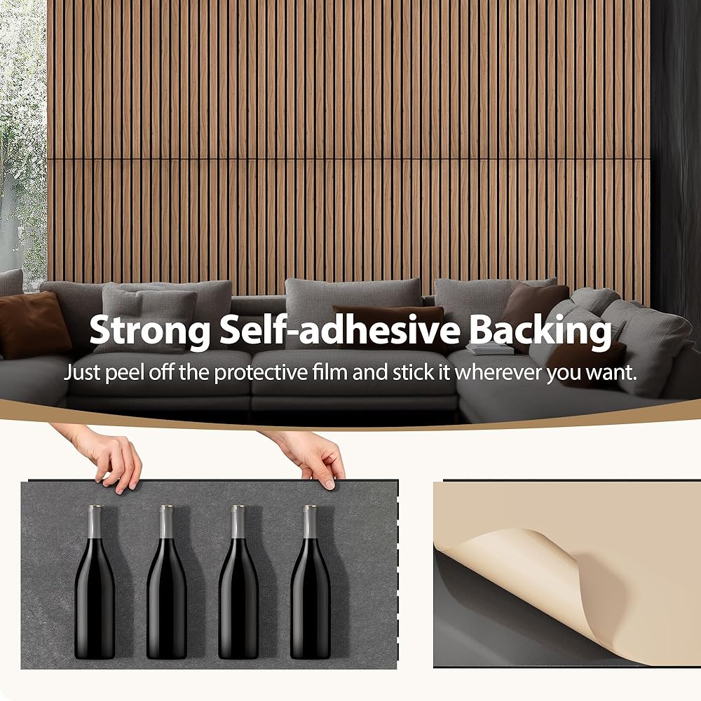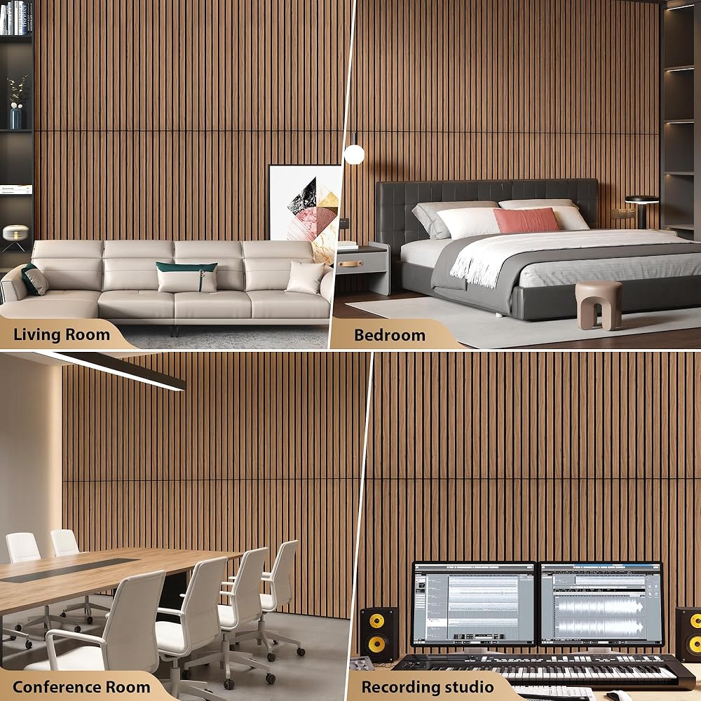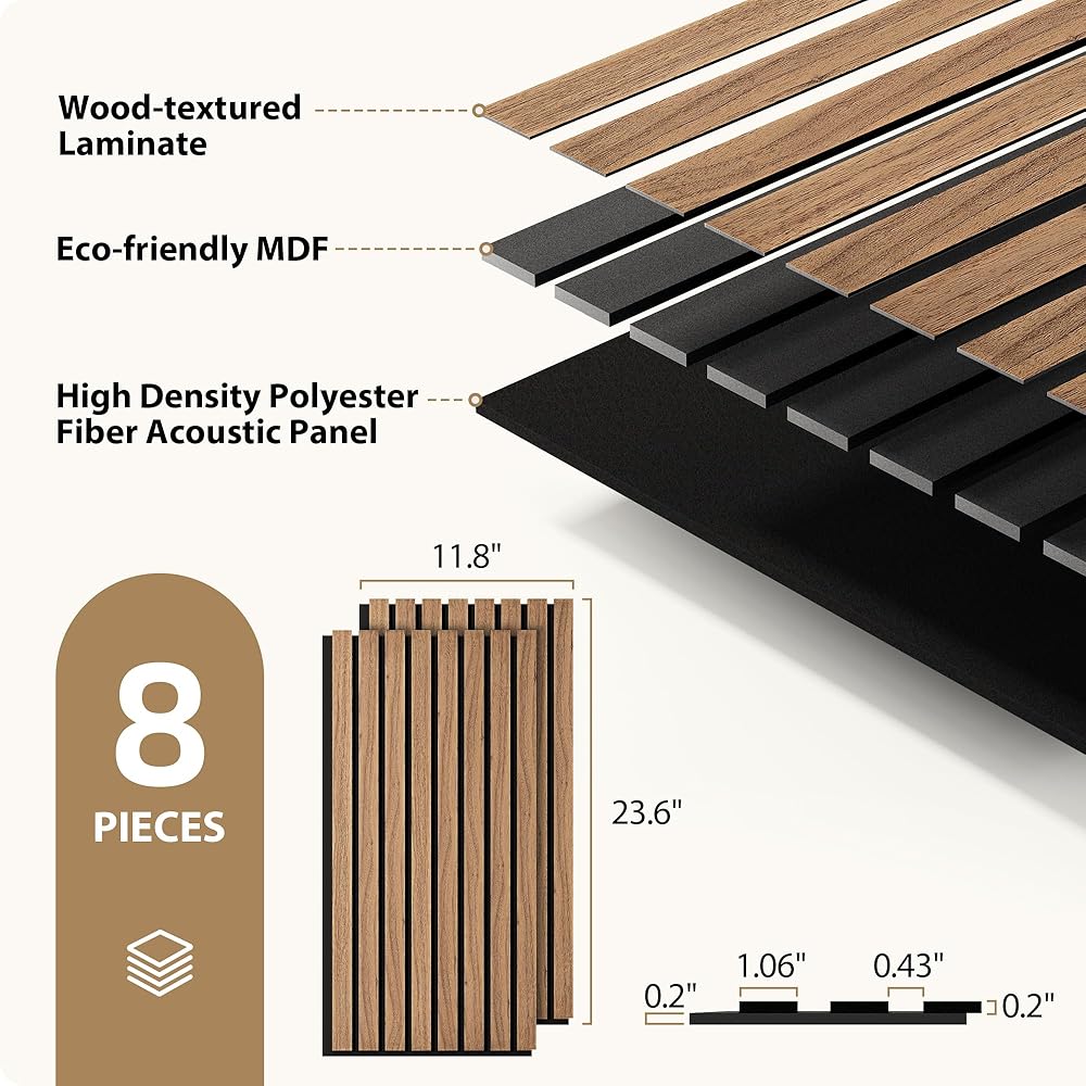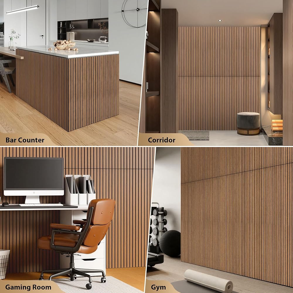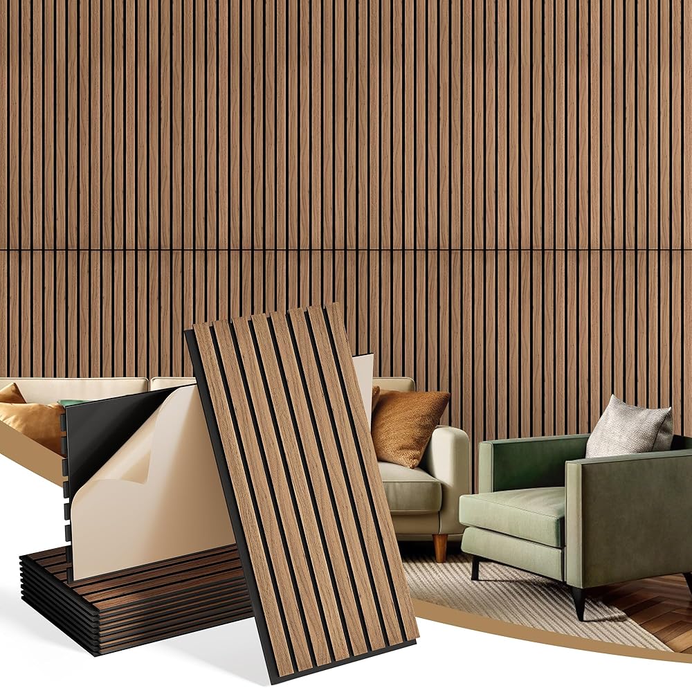 INMOZATA 8 عبوات من الألواح الخشبية الصوتية المخددة مقاس 11.8 بوصة × 23.6 بوصة، وألواح جدارية قابلة للتقشير واللصق لتزيين الجدران الداخلية، والمدفأة، وغرفة المعيشة، وغرفة النوم، والمكتب (الجوز)