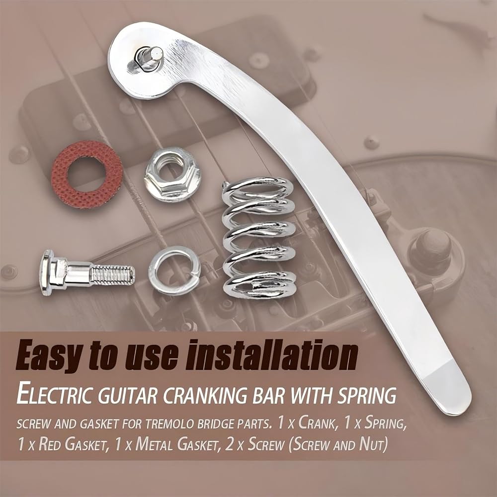 Crafted from high-quality zinc alloy with a lustrous chrome finish, this whammy bar is built to resist rust and corrosion, ensuring lasting durability through rigorous play. The kit includes everything you need for a straightforward installation: 1 x Tremolo Arm (Crank), 1 x Spring, 1 x Nut, 1 x Red Gasket, 1 x Metal Washer, and 1 x Screws.