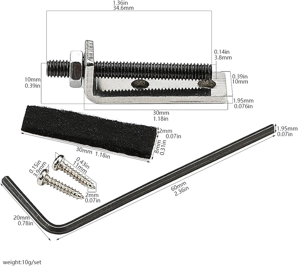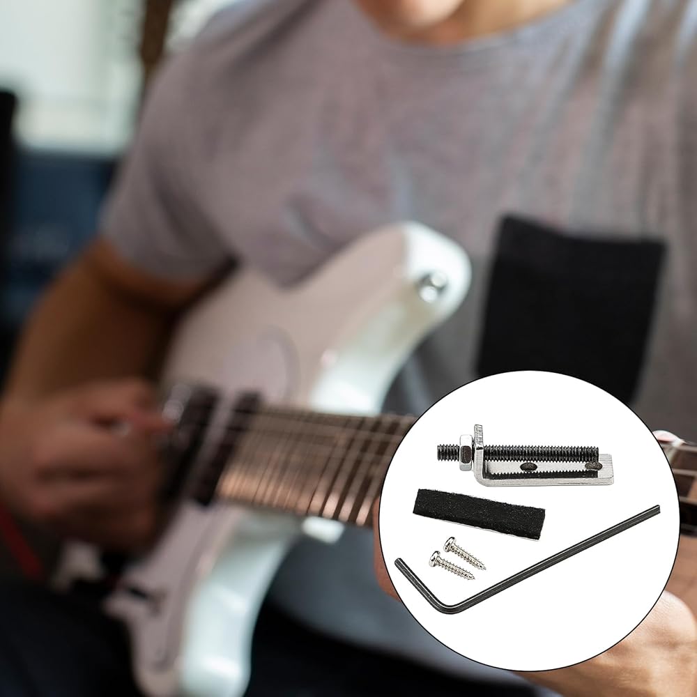 Features: Keep your guitar in tune and keep your bridge locked in place. Tremolo Stop Lock Keep your "Floating" Tremolo in tune and in control. Easy installation and easy adjustments, using wrench to lock it in position. Prevents inadvertent vibratos effects produced by resting the picking hand over the bridge while playing, Screwed into the rear cavity between the tremolo springs, it provides a back stop for the bridge. Package includes: 1pc tremolo stopper,1pc felt pads, 2pcs mounting screws, 1pc wrench. Specifications: Materials: Metal Size: As shown in the picture Note: Please allow 1-2cm errors due to manual measurement, make sure that you do not mind before you order. Due to the difference between different monitors, the picture may not reflect the actual color of the item. Package includes: 1set Tremolo Stopper