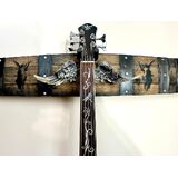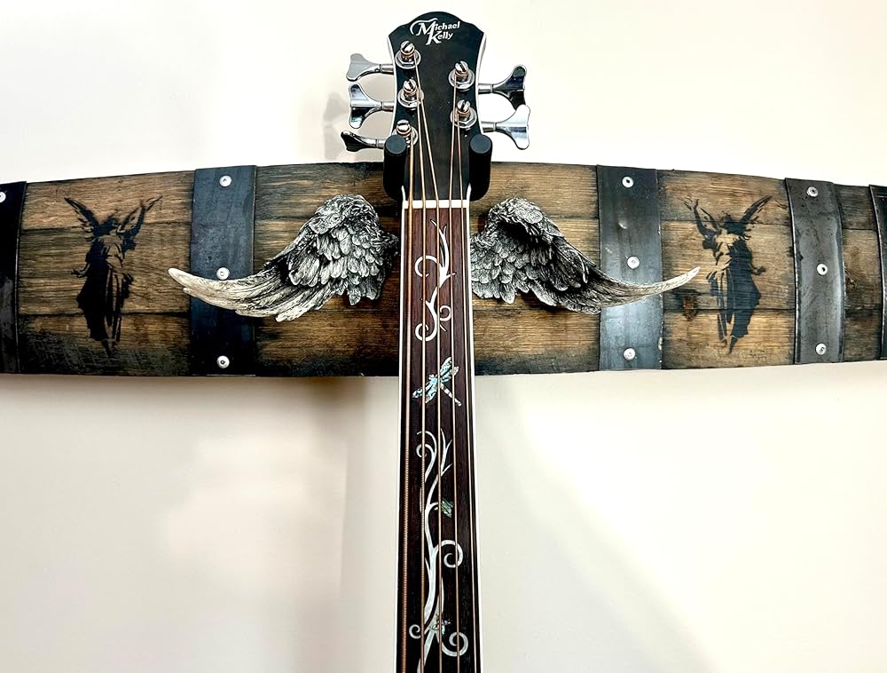 Remembrance/Memorial Angelic Instrument displays. Handmade from aged oak barrels. Angelic Impressionism integrated with natural aging. Individually hand cast and shaded wings, made from designer resin. Each piece is carefully hand crafted, drilling, riveting and cutting the steel banding. I file the sharp edges off each piece. I'm sure I will occasionally miss a spot, so please be aware of the cut edges on the steel..handle carefully! Mounting braces and hardware are pre-installed. Keyhole mounting hardware is approximately 16” apart for easy stud mounting. (Check precise measurements before anchoring the screws) some may be 16-1/8” apart. Drywall anchors included for hanging elsewhere. Wings are removed for shipping. This is to prevent breakin. The holes will be pre-drilled and oversized, so you can position, angle or rotate the wings how you would like before tightening them up (they don't need to be tightened much) finger tighten wing nut. I will also leave the instrument holder off of the piece and include screws that don't require pre-drilling, as it looks better in different places with different instruments. For example it looks nicer up higher with a long scale bass with a large headstock, the wings don't get lost and cluttered together with the headstock then. If you're displaying a violin, you may not want the mount quite as far above the wings. Every piece is unique, handmade and hand shaded and incorporate natural materials. No two pieces are identical. I try to keep as much uniformity and consistency as possible. They all look pretty similar. We have a lot of artists and musicians in our family. I was reading a product review one day and realized that I didn't really notice that having instruments from family and friends sitting in a closet collecting dust was bothering me inside without me even being aware of it. Meanwhile on the other side of that nagging energy, when I have the same person's meaningful object, with all of that energy and emotion attached displayed in a nice way. It reminds me of good memories of them doing something they loved with people they loved and I smile a little and sometimes recover a memory that I had forgotten. I like it much more than seeing an abandoned looking dusty instrument sitting in the dark. Then feeling bad because it was important to someone I love, and held a lot of memories that I had forgotten. Anyway, I hope this could be as helpful to you!