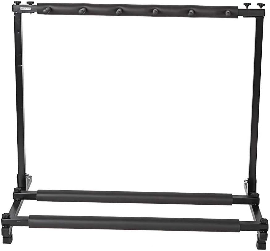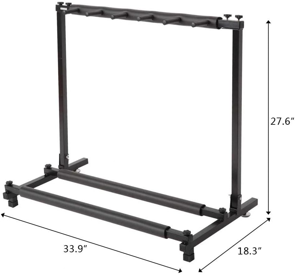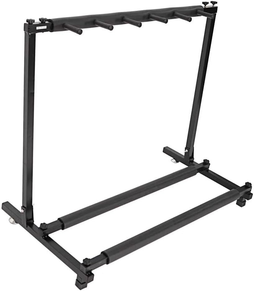 Designed for guitar collectors, musicians, and home studios, this heavy-duty 5-string folding guitar stand offers secure, space-saving storage for up to five instruments — including acoustic, electric, and bass guitars. Built with a robust iron frame and reinforced square-tube construction, it delivers unmatched stability while protecting your instruments with soft, finish-safe black neoprene rubber padding on each cradle. The innovative foldable design allows for effortless setup and compact storage — ideal for small spaces, touring musicians, or studio organization. Whether displayed as a statement piece or used for daily storage, this stand combines industrial strength with sleek, minimalist aesthetics in a durable black finish.