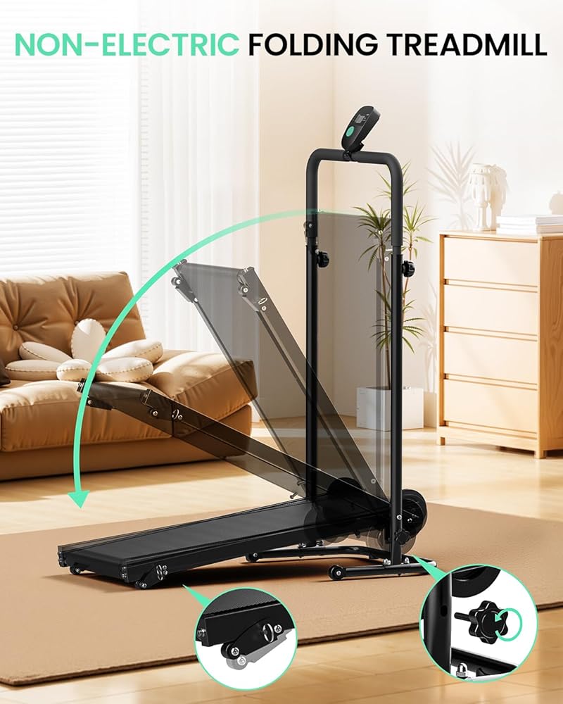 جهاز مشي غير كهربائي مع دولاب موازنة مزدوج وانحدار ثابت - جهاز مشي بدون محرك من AKLUER مع شاشة LCD، تصميم صغير قابل للطي للمنزل الصغير/صالة الألعاب الرياضية، حزام غير قابل للانزلاق، مقابض إسفنجية ناعمة للمشي/الركض