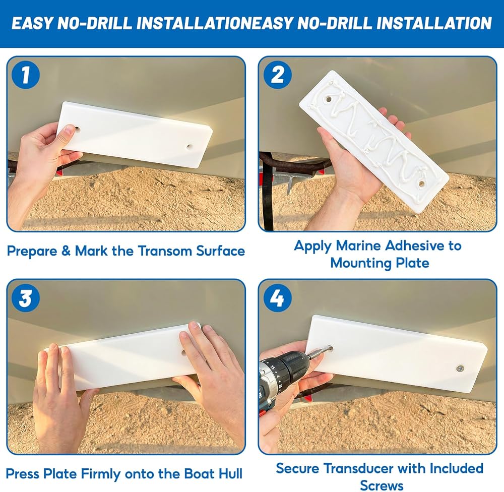 • 🚢Installation is simple and requires no permanent hull modification. Just sand the hull area with 120-grit sandpaper, apply marine-grade adhesive, and secure the transducer mounting board. The included pre-drilled holes and stainless steel screws allow for immediate transducer mounting. This streamlined no-drill process saves hours and protects your boat's integrity.