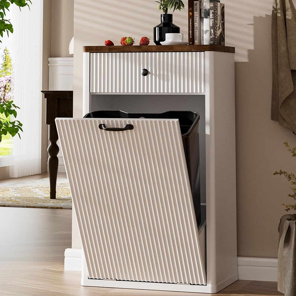 خزانة سلة المهملات الحديثة: خزانة سلة المهملات القابلة للإمالة بسيطة وعملية. تعمل الألواح المخددة الفريدة على تحسين الملمس وتعزيز المظهر البصري. يمكن دمجها بسهولة في مجموعة متنوعة من أنماط الديكور. مثالية لتزيين مطبخك وغرفة المعيشة والحمام وغرفة النوم وما إلى ذلك. كما يمكن استخدامها كجزيرة مطبخ ومناسبة لتخزين طعام الكلاب وطعام القطط وما إلى ذلك.