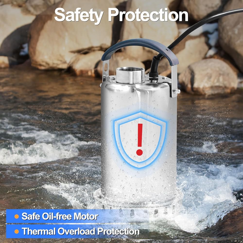 مضخة عالية الجودة من الفولاذ المقاوم للصدأ: هيكل كامل من الفولاذ المقاوم للصدأ 304 يضمن مقاومة التآكل والمتانة وقدرة تبريد أفضل. يدعم واقي الحمل الزائد الحراري المدمج التشغيل المستمر في تطبيقات إزالة المياه