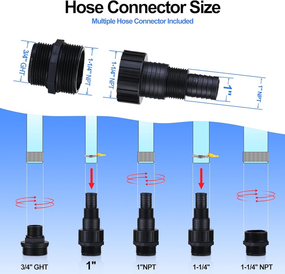 سهل الاستخدام: سلك طويل مقاوم للماء ومقبض محمول يسمح بالتركيب المريح من موضع أبعد. يأتي مع 3 محولات بلاستيكية: 1 بوصة و1-1/4 بوصة توصيل خراطيم التفريغ لضخ عالي السعة؛ 3/4 بوصة GHT يربط الخراطيم الملولبة. مناسبة للعديد من السيناريوهات المختلفة