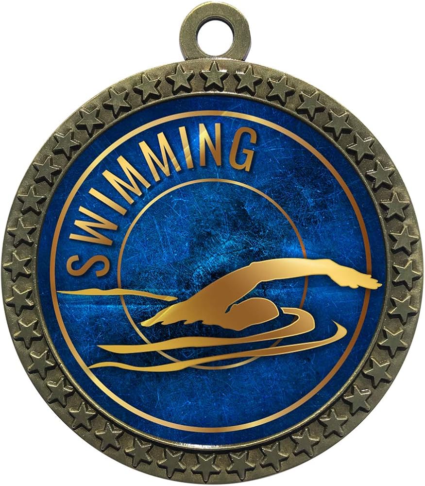 • 10- حزمة من جوائز السباحة المعدنية المصبوبة بقطر 2-1/2 بوصة. تحتوي كل ميدالية على شريط رقبة أحمر وأبيض وأزرق بعرض 7/8 بوصة لعرض ميدالية الجائزة بفخر