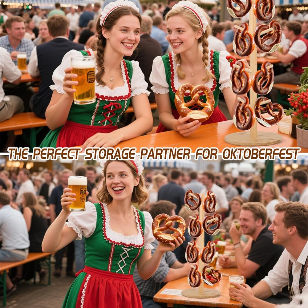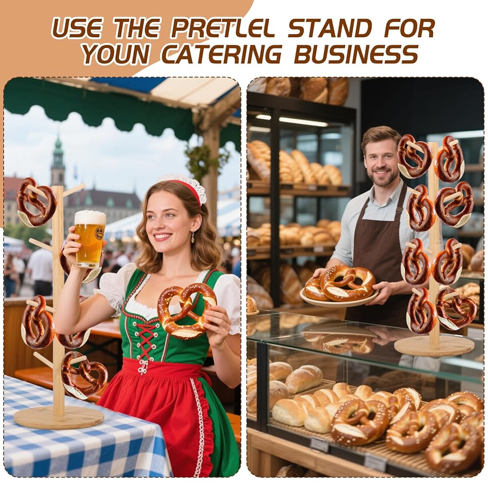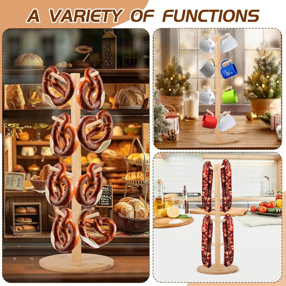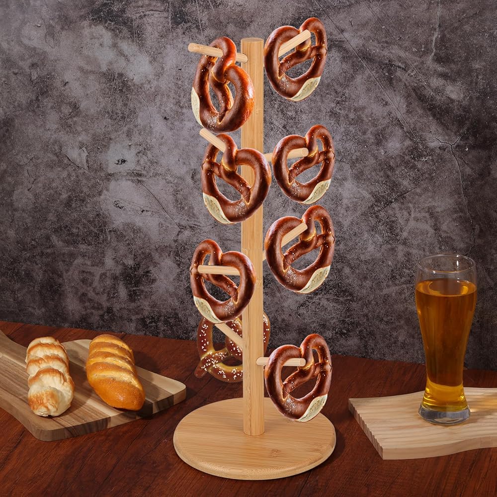 【Wide Application】 This bagel stand is ideal for Oktoberfest celebrations, parties, family gatherings, bakeries, or catering events—and just as handy for everyday kitchen use. This versatile stand works beautifully as a pretzel holder, mug tree, bagel rack, bread display, or party serving rack, blending function with rustic charm.