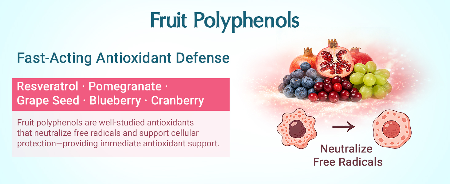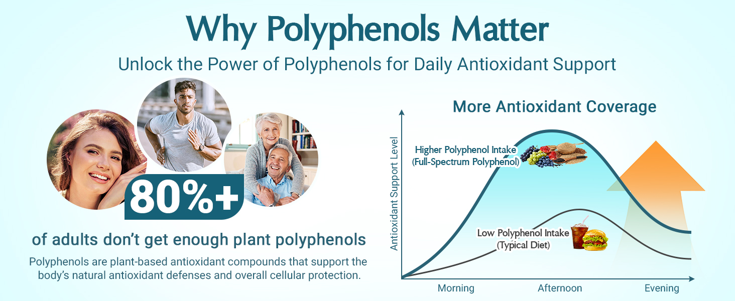 • بوليفينول كامل الطيف ثلاثي المصادر: على عكس تركيبات التوت التقليدية فقط، يوفر مكمل البوليفينول القوي الخاص بنا 1500 مجم لكل جرعة من ثلاثة مصادر تكميلية: بوليفينول الفاكهة والأعشاب والحبوب. توفر مستخلصات الفاكهة مضادات الأكسدة، وتوفر الأعشاب عناصر حيوية نباتية متنوعة لتحقيق التوازن الخلوي، في حين تضيف بوليفينول الحبوب مغذيات نباتية داعمة للأمعاء غالبًا ما تكون مفقودة من الصيغ القياسية، مما يخلق صورة أكثر اكتمالاً مضادة للأكسدة من أجل الصحة والحيوية اليومية.