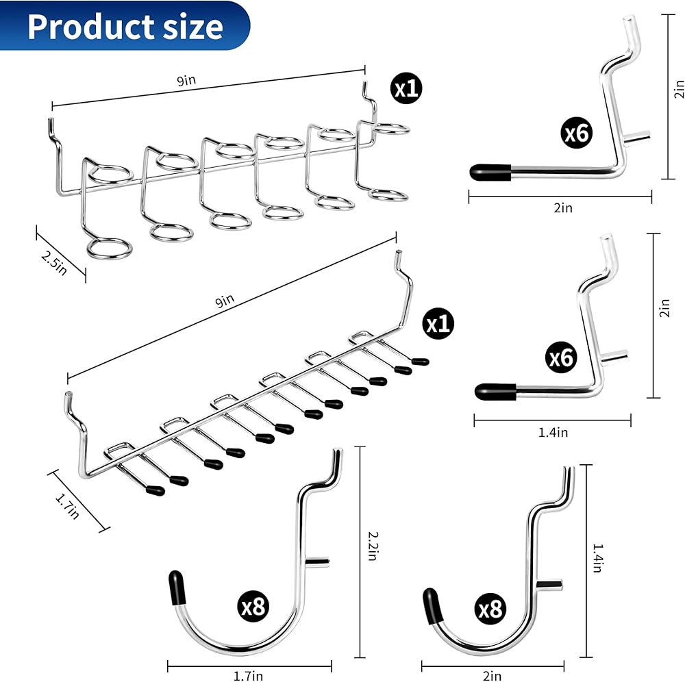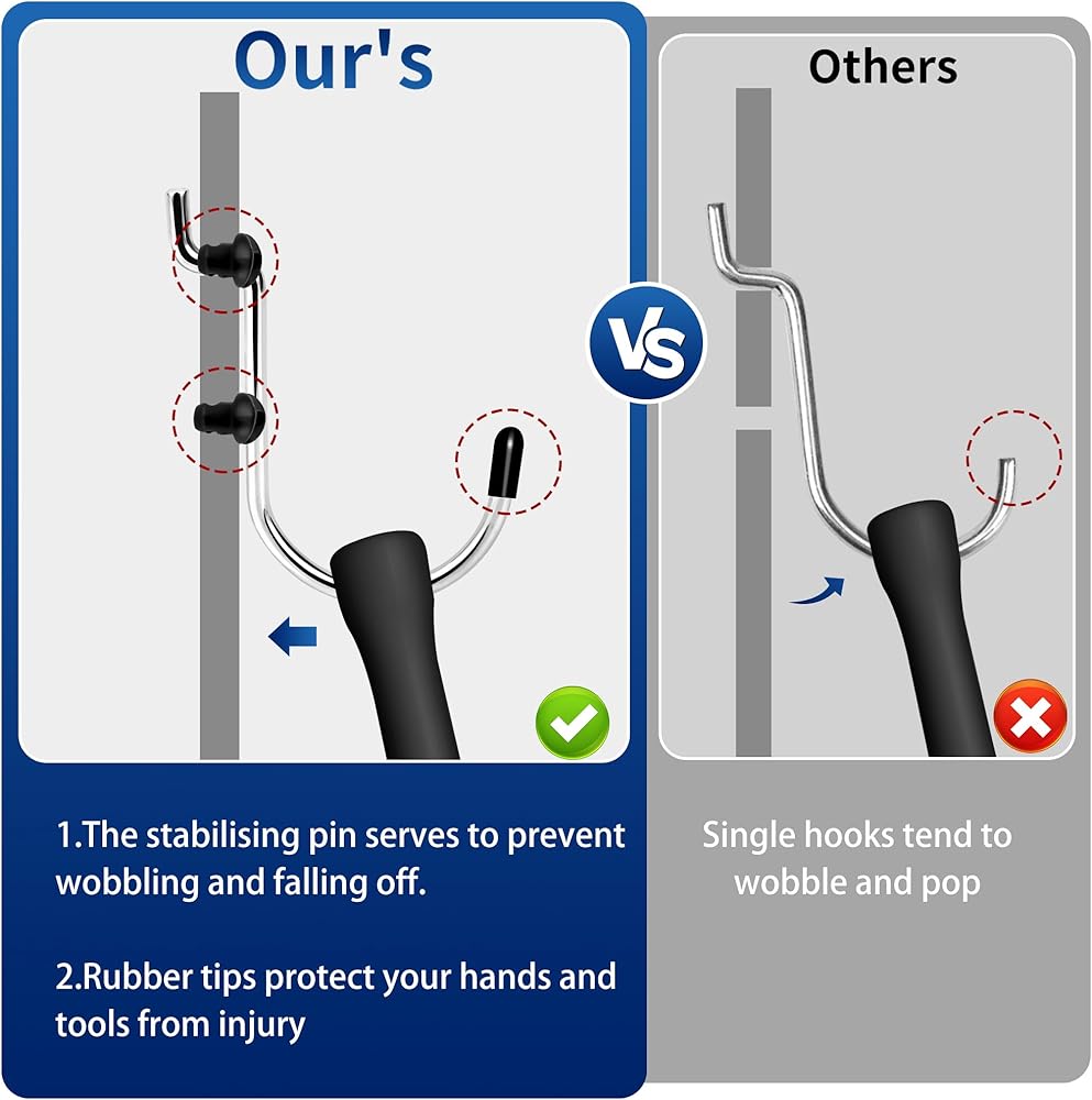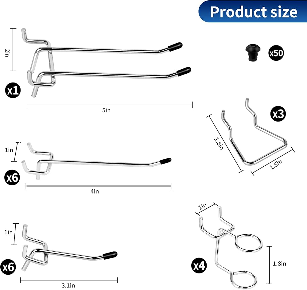 قوة صنع الفولاذ: قوة لا هوادة فيها تلبي التصميم الأنيق مع خطافات Pegboard الخاصة بنا. مصنوعة من الفولاذ الصلب ومطلية بطبقة من الكروم، هذه الخطافات لا تصمد أمام اختبار الزمن فحسب، بل تقاوم أيضًا الصدأ والتآكل. اعتمد على المتانة والموثوقية، مع ضمان بقاء أدواتك منظمة بشكل آمن.